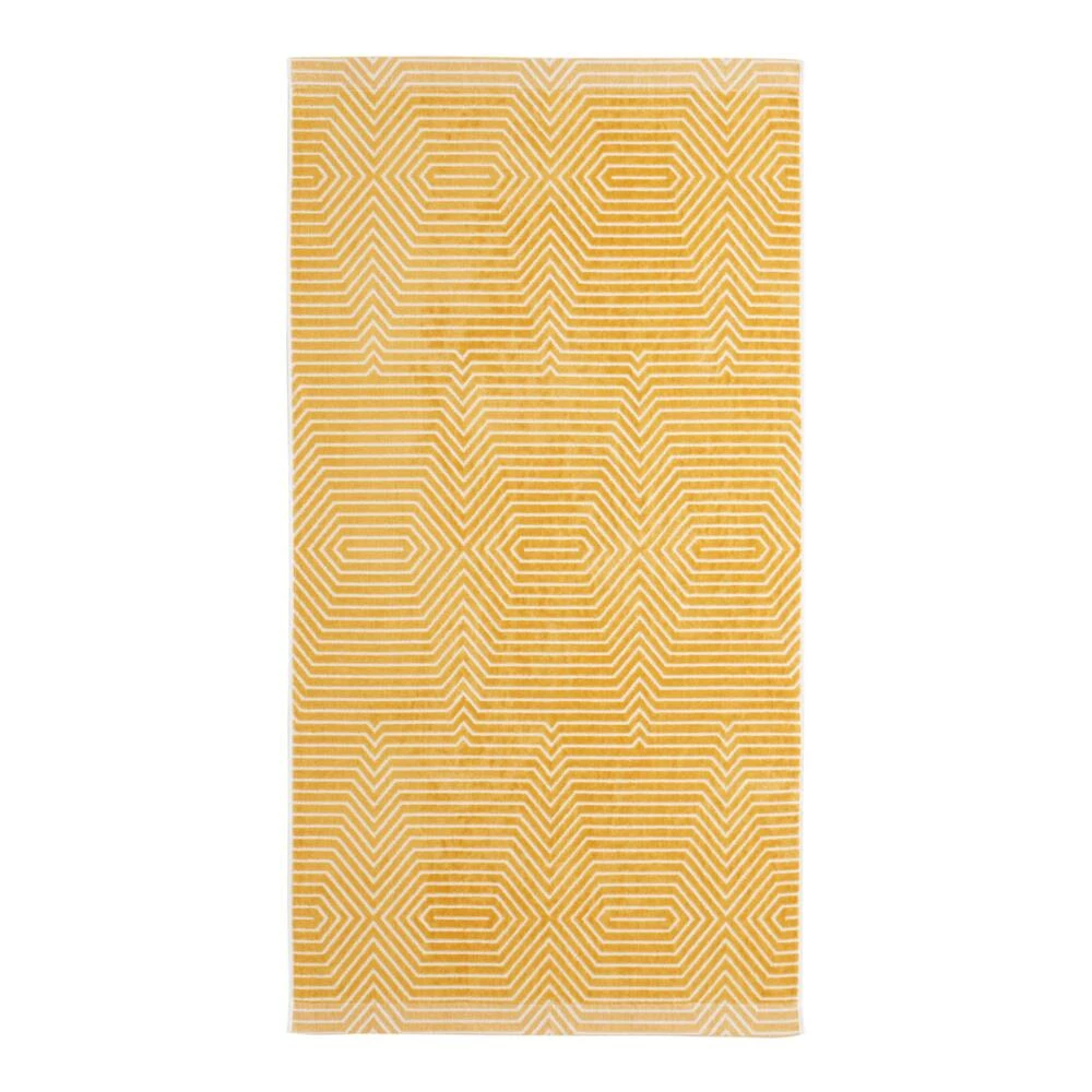 A modern take on an everyday necessity, our exclusive bath towel has a dimensional, sculpted geometric line design. Made in Portugal with a jacquard base in shades of mustard-yellow and white, it’s oh-so-soft to the touch with a luxe velour feel.