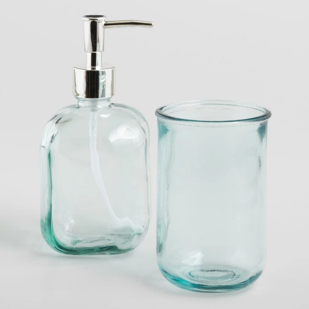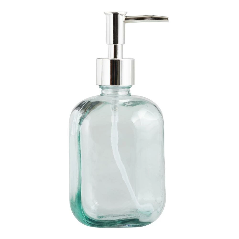 Crafted in Spain, our unique, exclusive soap dispenser is made from 100% recycled glass in a subtle aqua hue. It’s complete with a silver metallic pump for a chic, sleek look.