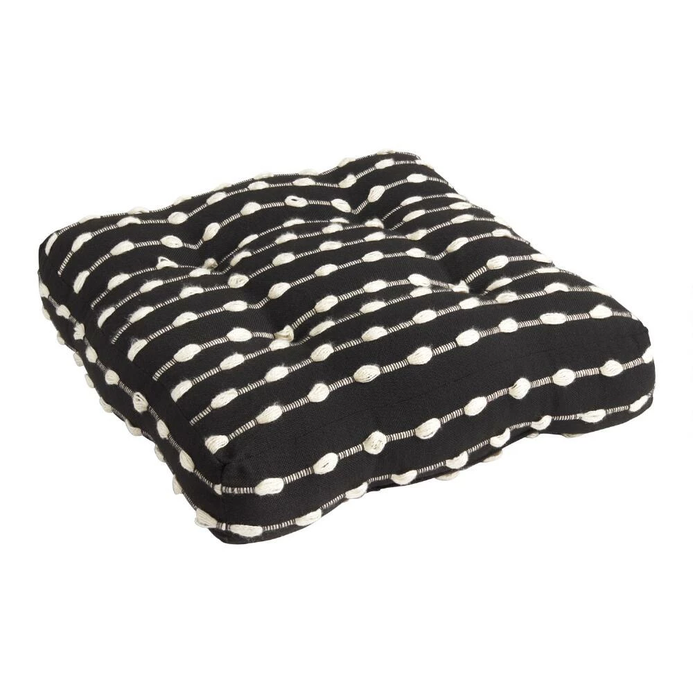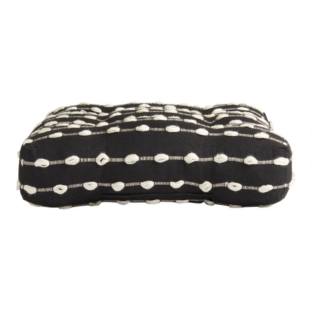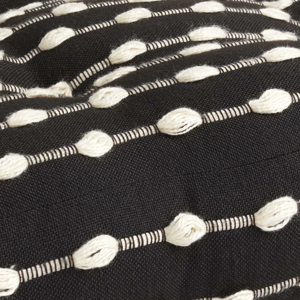 Embroidered ivory dots connected with lines contrast with the black background of this square floor cushion. Featuring an attached handle for easy movement around your space, you can add this comfy extra seat to any indoor or outdoor space to create a modern, pulled-together look. Made with an innovative recycling process that puts discarded water bottles to good use, our exclusive floor pillow makes a stylish statement.