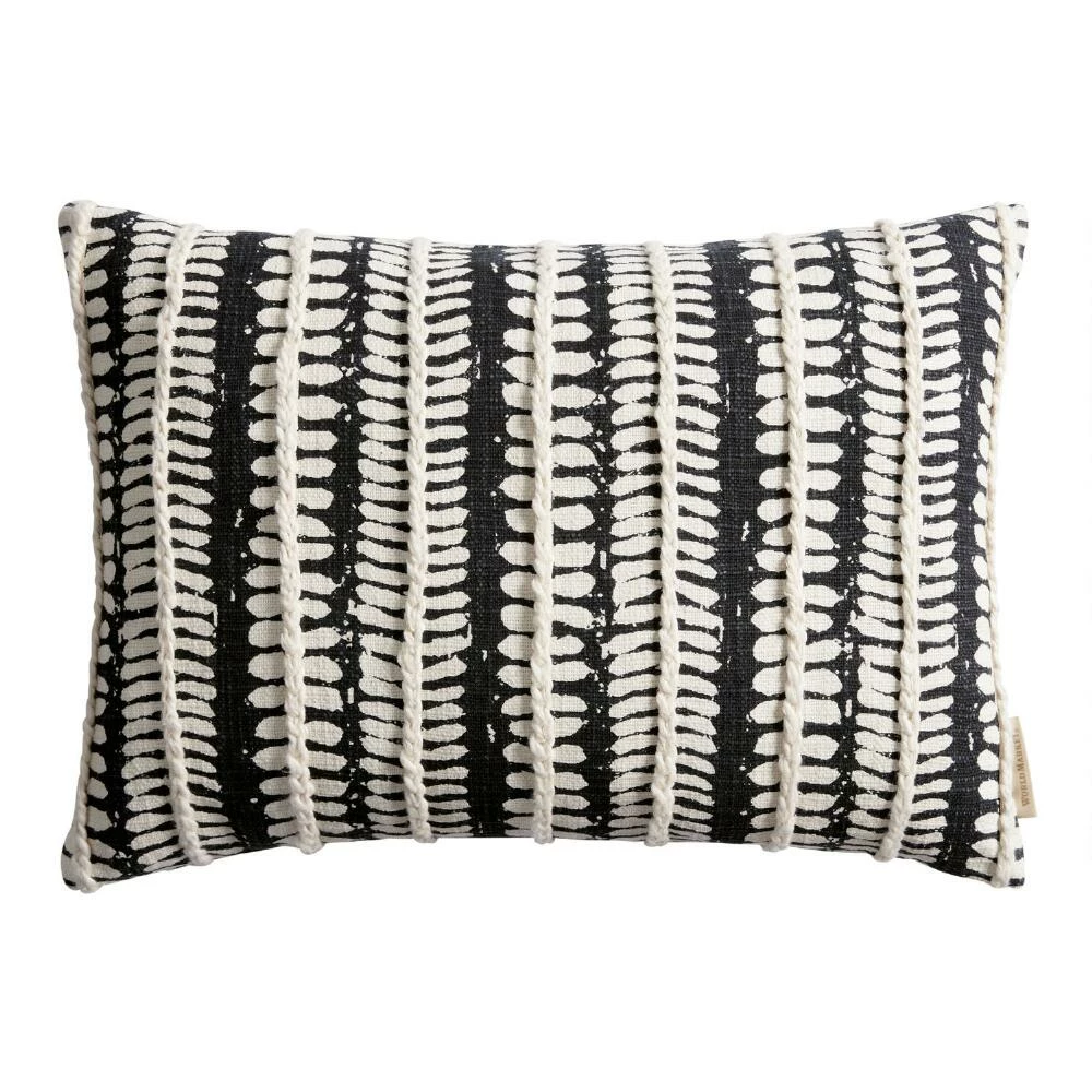 With a modern twist on a classic black and white color scheme, this on-trend screen-printed lumbar pillow offers both style and comfort. A leaf pattern in ivory is printed on a solid-black cotton slub base with braided detailing in vertical stripes throughout lending it texture. Perfect for seating areas or bedrooms, this exclusive pillow comes with a zip closure and removable insert for easy spot cleaning.