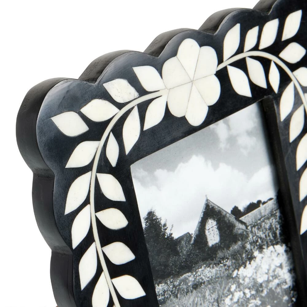 In a sophisticated scalloped shape, our exclusive 4×6 frame is decorated with a white floral inlay on a black backdrop. Handcrafted by skilled artisans of sustainably sourced bone, this frame lends chic botanical-inspired beauty to any tabletop display.