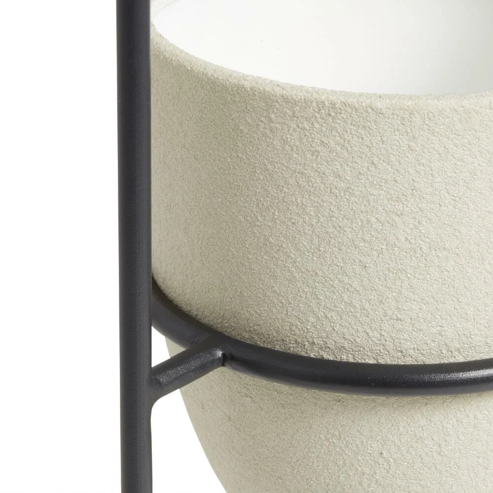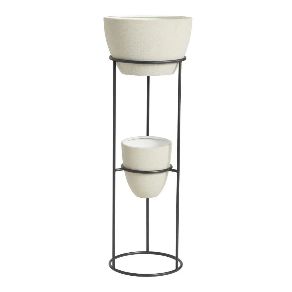 Double your greenery and elevate your style with this tall 2-tier planter. The open black metal base holds a pair of stacked gray cement pots, a small one in the middle and a broader one on top, perfect for succulents or lush trailing plants.