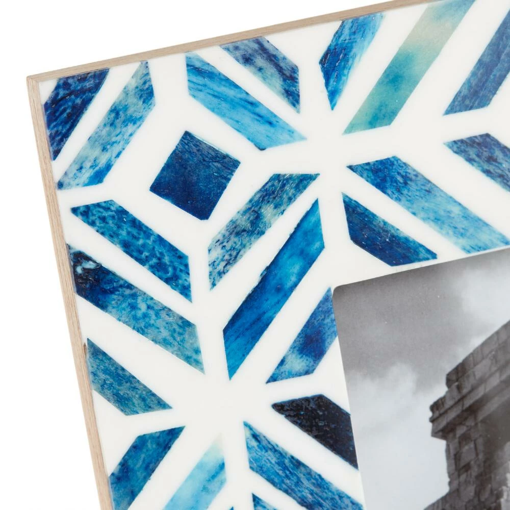 Handcrafted in India from sustainable, naturally shed bone, our 4×6 picture frame features a chic art deco-inspired tile design. The eye-catching blue and white geometric motif on our exclusive frame makes a lovely spotlight for a treasured snapshot and a charming gift.