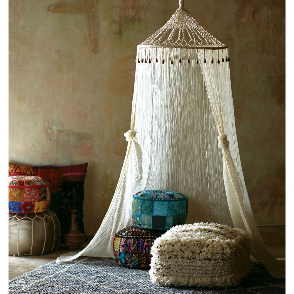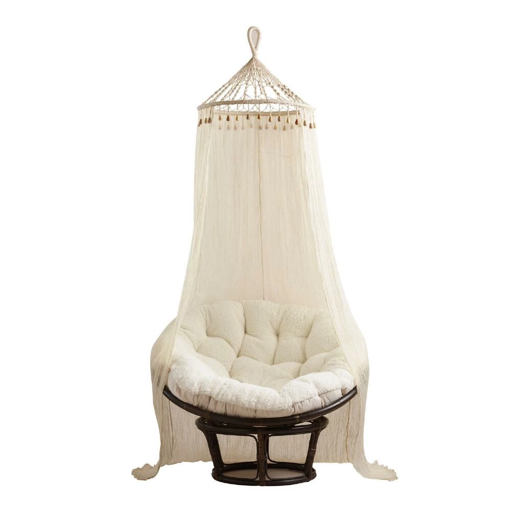 Crafted in India of sheer 100% cotton, our exclusive canopy features a macramé netting top with wood bead accents for added bohemian-chic flair. This gauzy accent looks incomparably romantic when draped over a bed, surrounding a papasan chair or shielding an outdoor entertainment area from pesky insects.