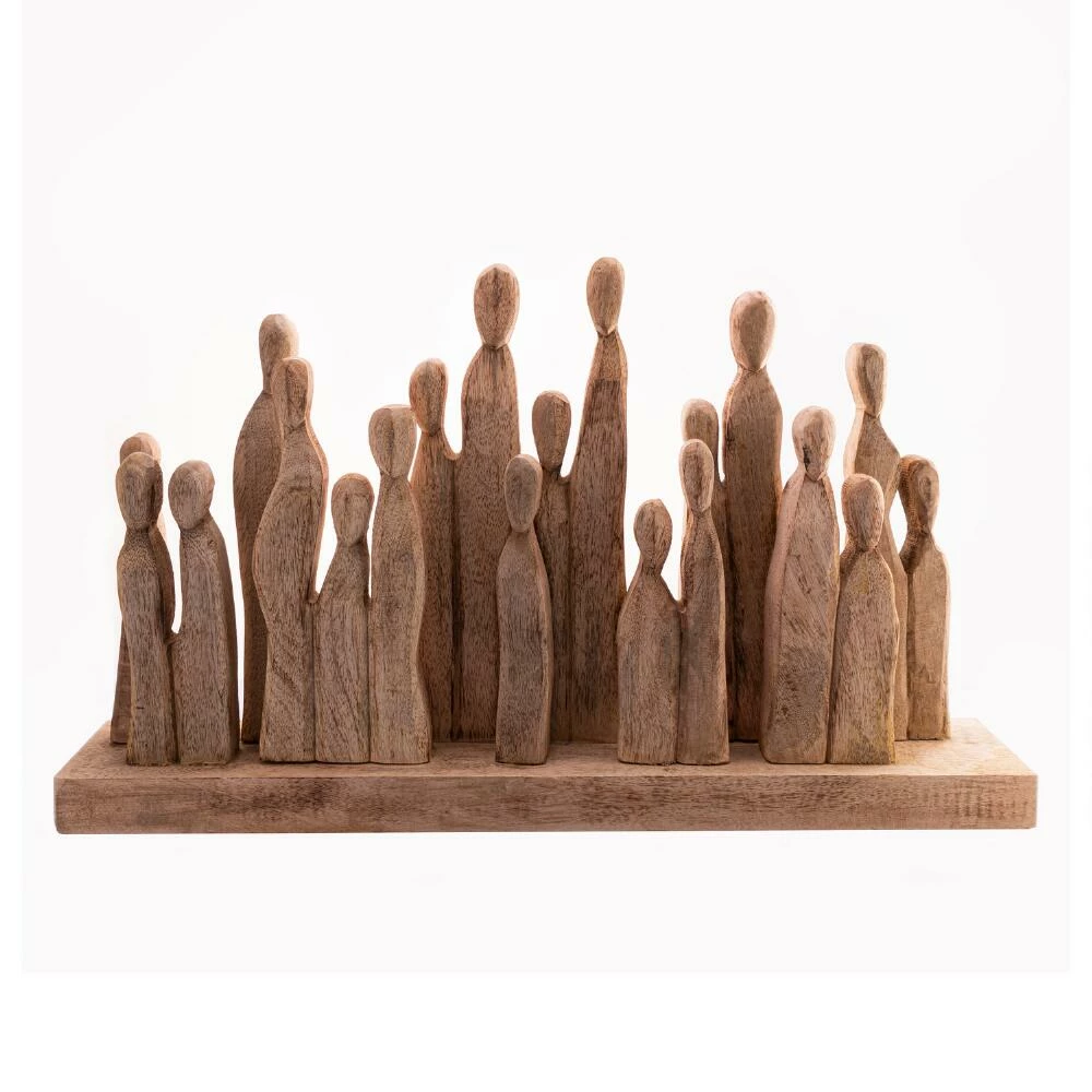 Hand-carved from mango wood by artisans in central India so that no two pieces are the same, this group of unadorned figures in varying shapes and sizes charms in its simplicity. Contrasting natural grains in the wood enhance the individuality of each form, giving an intimacy to the collective that draws you in. It makes a sublime minimalist focal point for any room.