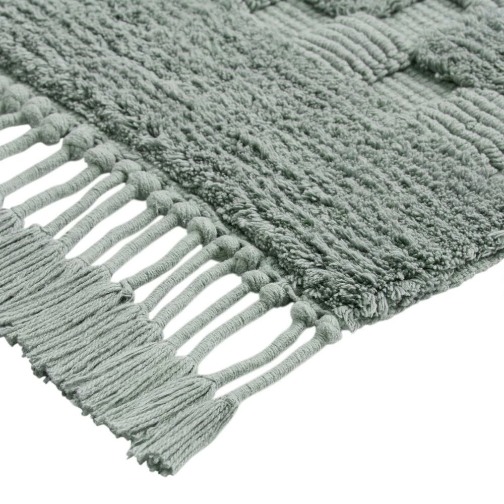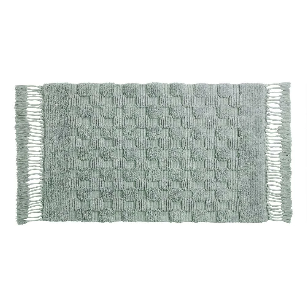 Featuring a modern geometric design of alternating woven and tufted dots and finished with fluffy string tassels, our exclusive bath mat makes a soft landing spot for bare feet. In a modern muted green hue, it coordinates perfectly with a variety of bath