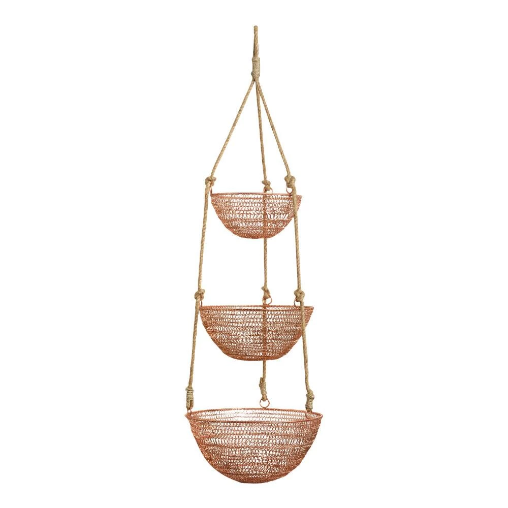 Featuring copper-finished baskets bound by jute rope, our three-tier hanging basket is a rustic, space-saving storage solution. From storing your fruits, vegetables and other kitchen essentials to a DIY planter filled with potted greenery by a sunny window, you can customize each tier to create a functional and chic look.