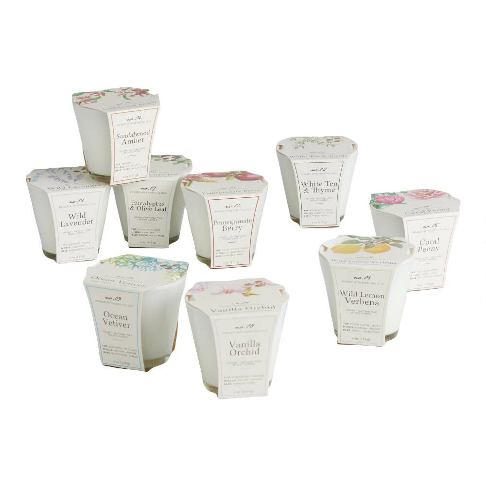 Wonderfully scented wax fills a frosted glass jar wrapped in paper to make our delightful candle. Scented with natural essential oils, this small candle has an incredible aroma and is available in multiple floral and herbal fragrances. Choose from soothing Wild Lavender, fresh Ocean Vetiver, luscious Vanilla Orchid, rich Sandalwood Amber, effervescent Pomegranate Berry, calming White Tea & Thyme and more.