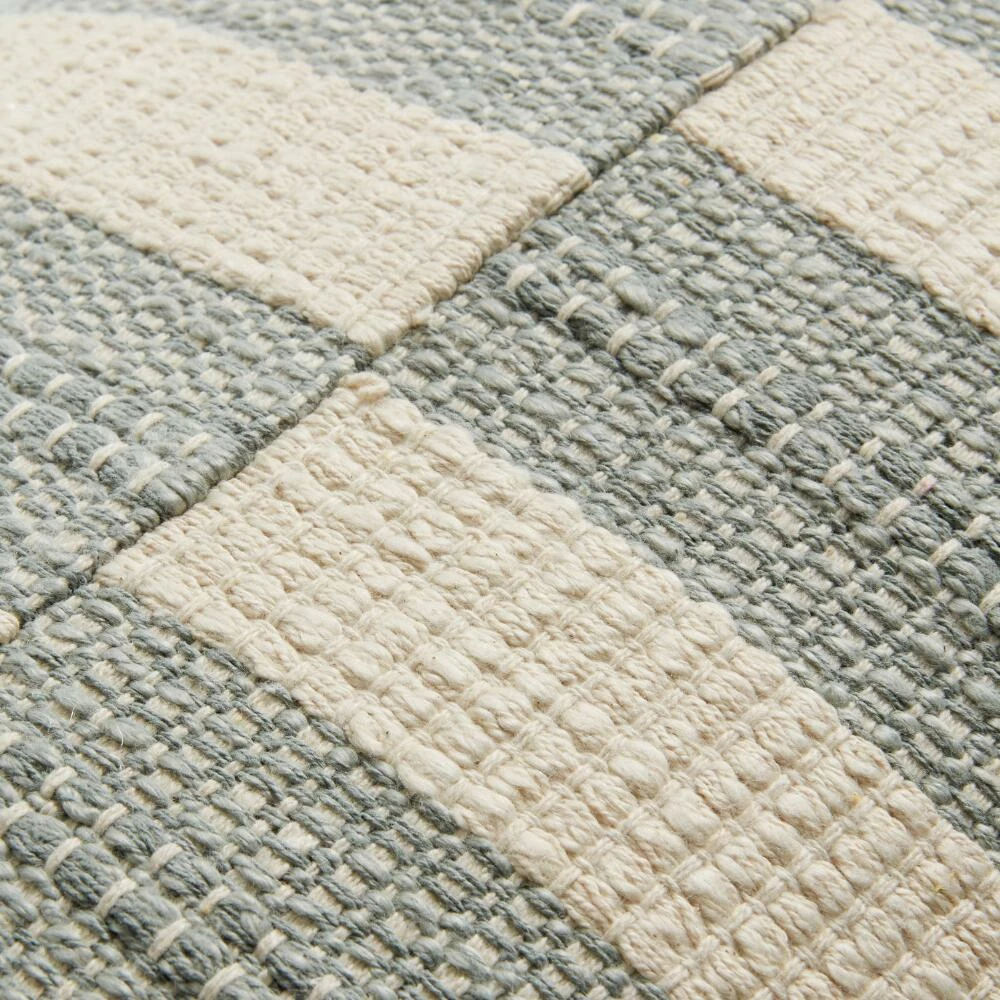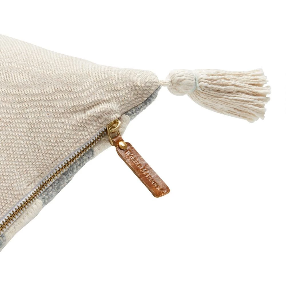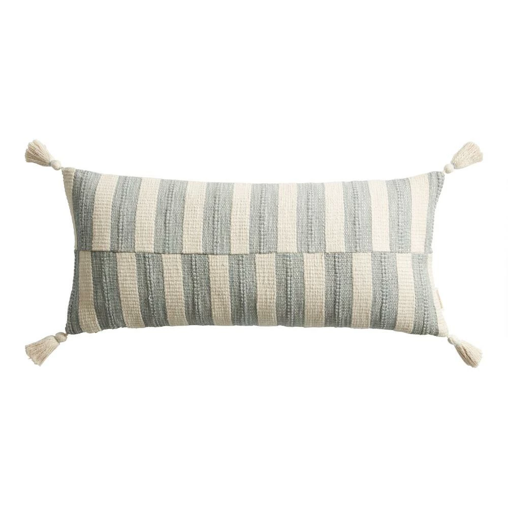 Brighten up your home decor with our cheery aqua and ivory oversized lumbar pillow. Vertical offset stripes run the length of this extra-wide pillow, and each corner features an ivory tassel. Complete with a removable insert making spot cleaning a cinch, this toss pillow comes with an elevated gold zipper.