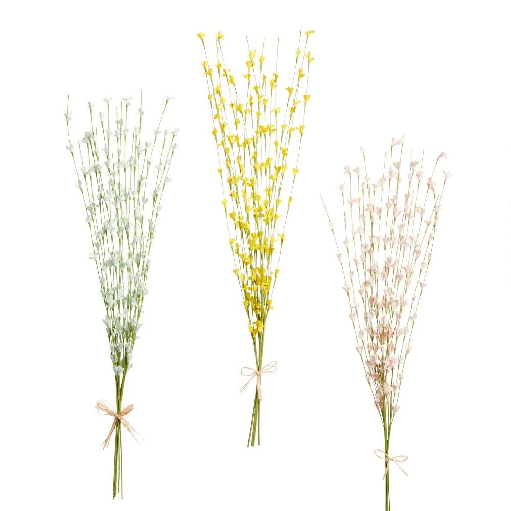 Rows of tiny, delicate faux blossoms bloom along the branches of these fresh-looking fake stems. Cheerful in springtime shades of yellow, pink or blue, these artificial beauties lend fresh color and lush texture to any arrangement.