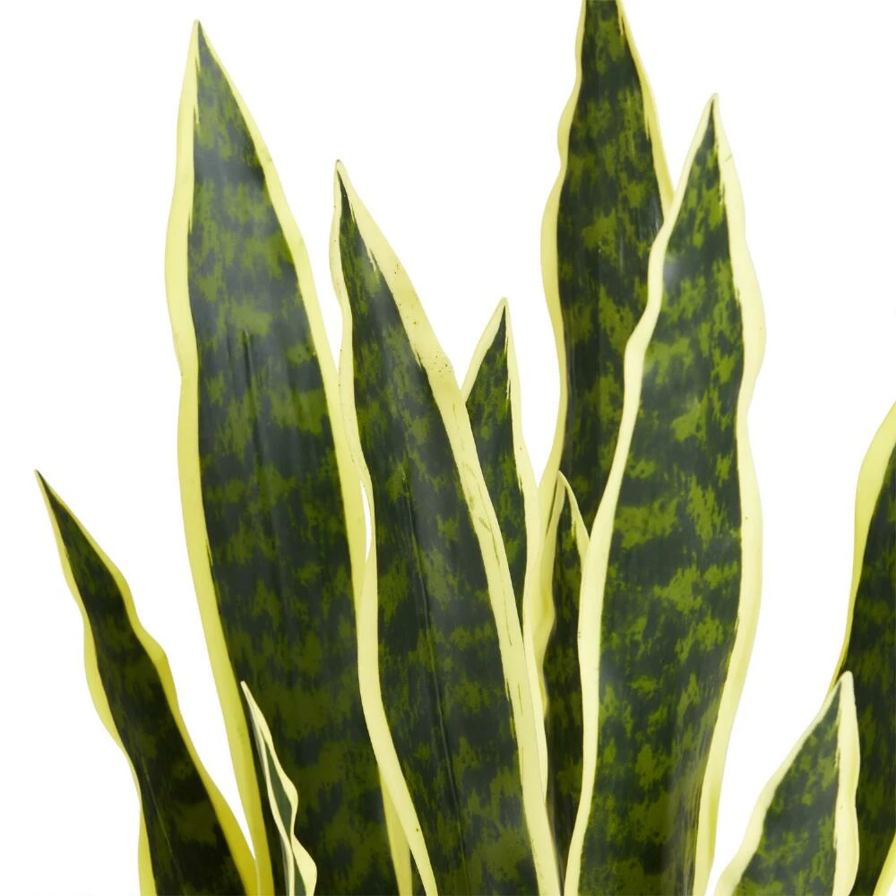 Add sunny color and serpentine beauty to your space with our stately fake snake plant. Featuring tall, sturdy green leaves rimmed in yellow, this artificial stunner comes in a simple black pot that drops easily into the basket or planter of your choice.