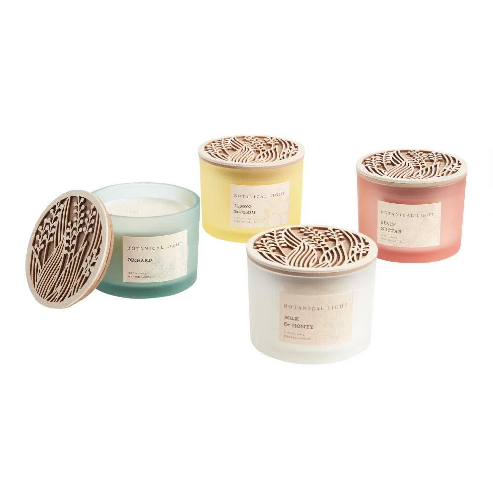 The spring-inspired fragrance of our scented candle fills your space with uplifting seasonal aromas. Set in a frosted glass jar in an array of fresh hues, it’s finished with a decorative wood lid featuring a delicate, laser-cut spring design. A sweet gift, choose from fruity Orchard, soothing Milk & Honey, tropical-sweet Peach Nectar and zesty Lemon Blossom and let the three wicks waft a freshening bouquet around your home.