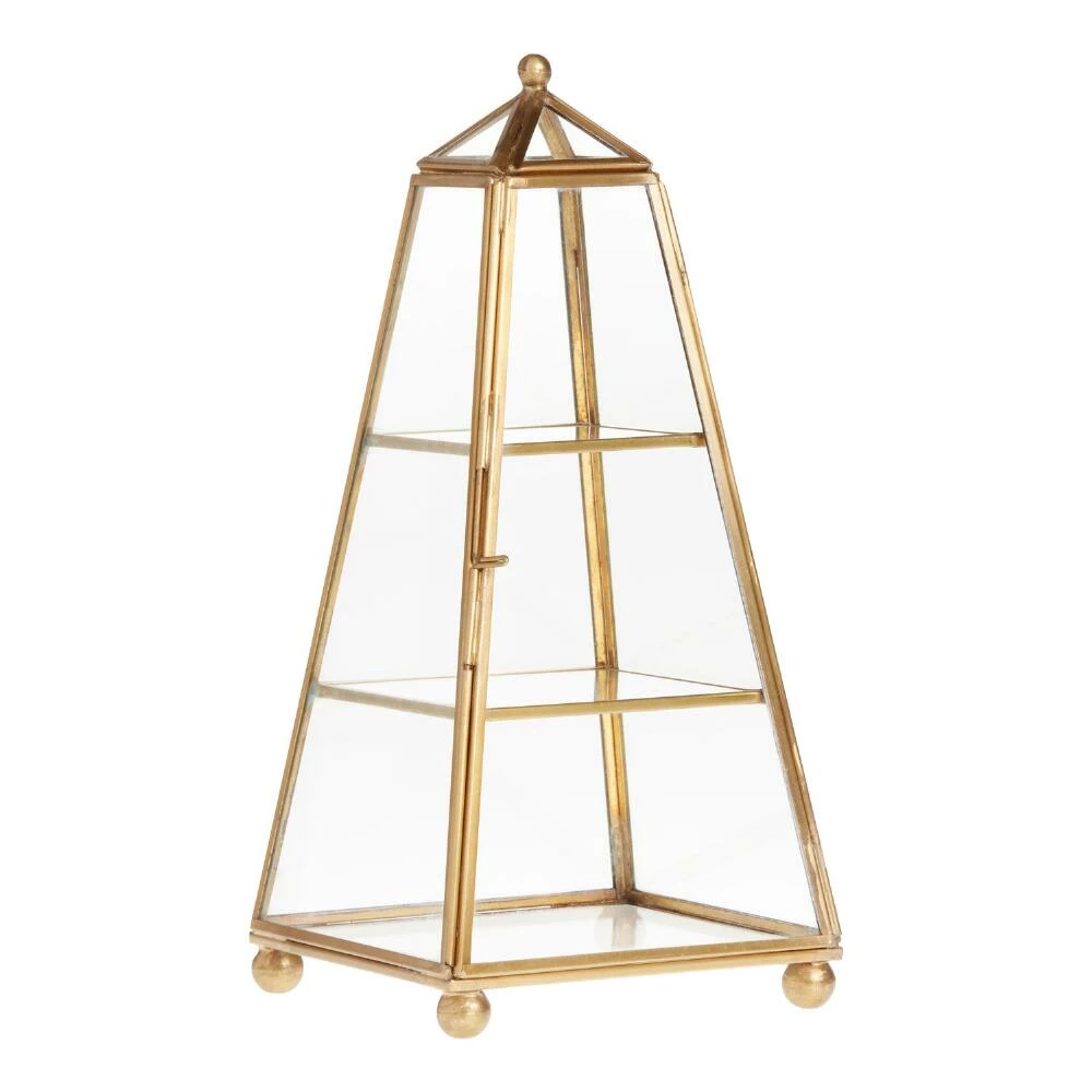Add intrigue to your bookshelf, mantel or desktop with our petite pyramid-shaped display case. With a gold metal frame, it features a small hinged door and three compartments to show off your miniature curios through clear glass.