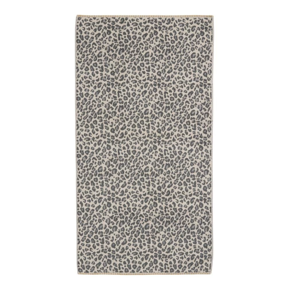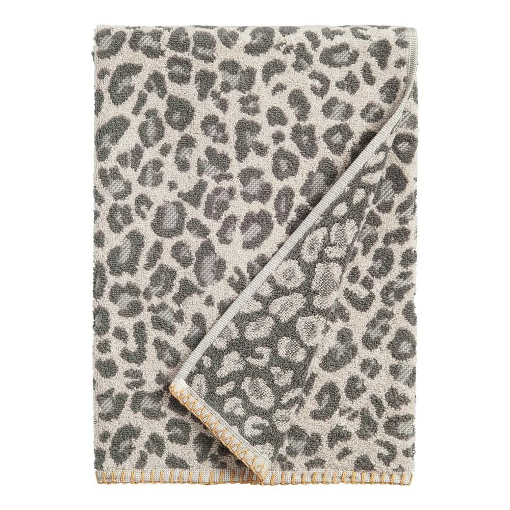 Our exclusive reversible bath towel features an allover leopard print in ivory and tones of gray, complete with a mustard-yellow blanket stitch on the ends. Made in Portugal of 100% cotton, it’s equal parts soft and chic and brings some wild style to your washroom.