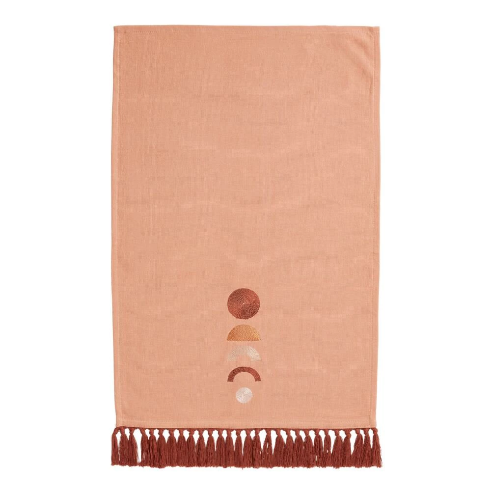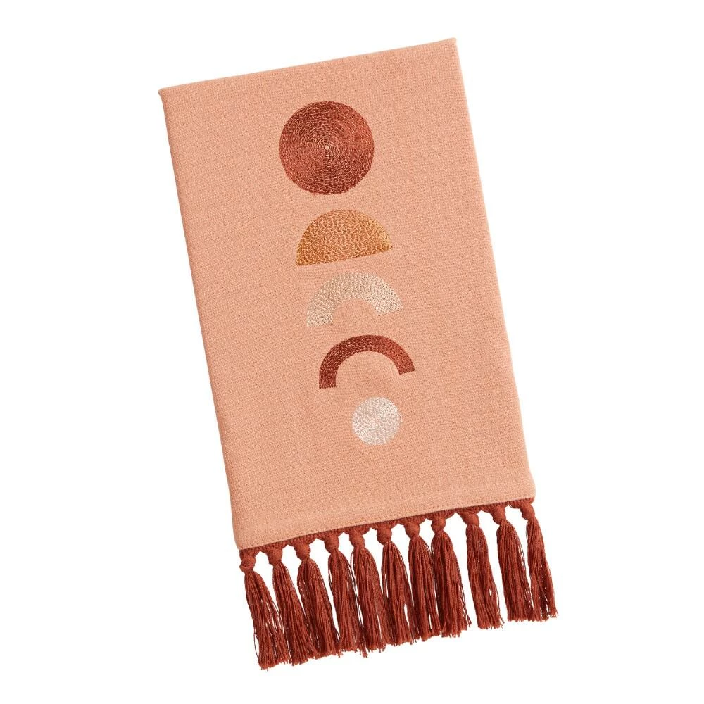 With modern circle motif, swingy tassels and warm terracotta and a blush-pink palette, our hand towel instantly upgrades your daily handwashing. Made in India of terrycloth fabric known for its absorbency and ultra-plush feel, this small towel brings a dash of desert-bohemian style to your bathroom decor.
