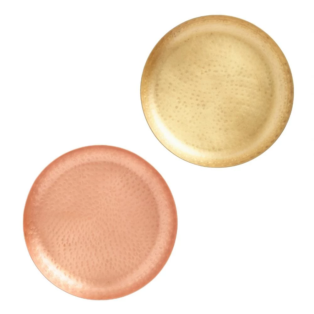 Hand hammered by artisans in India, our candle plates are finished in antiqued brass and matte copper. These handcrafted accents add global flair to your favorite pillar candle.