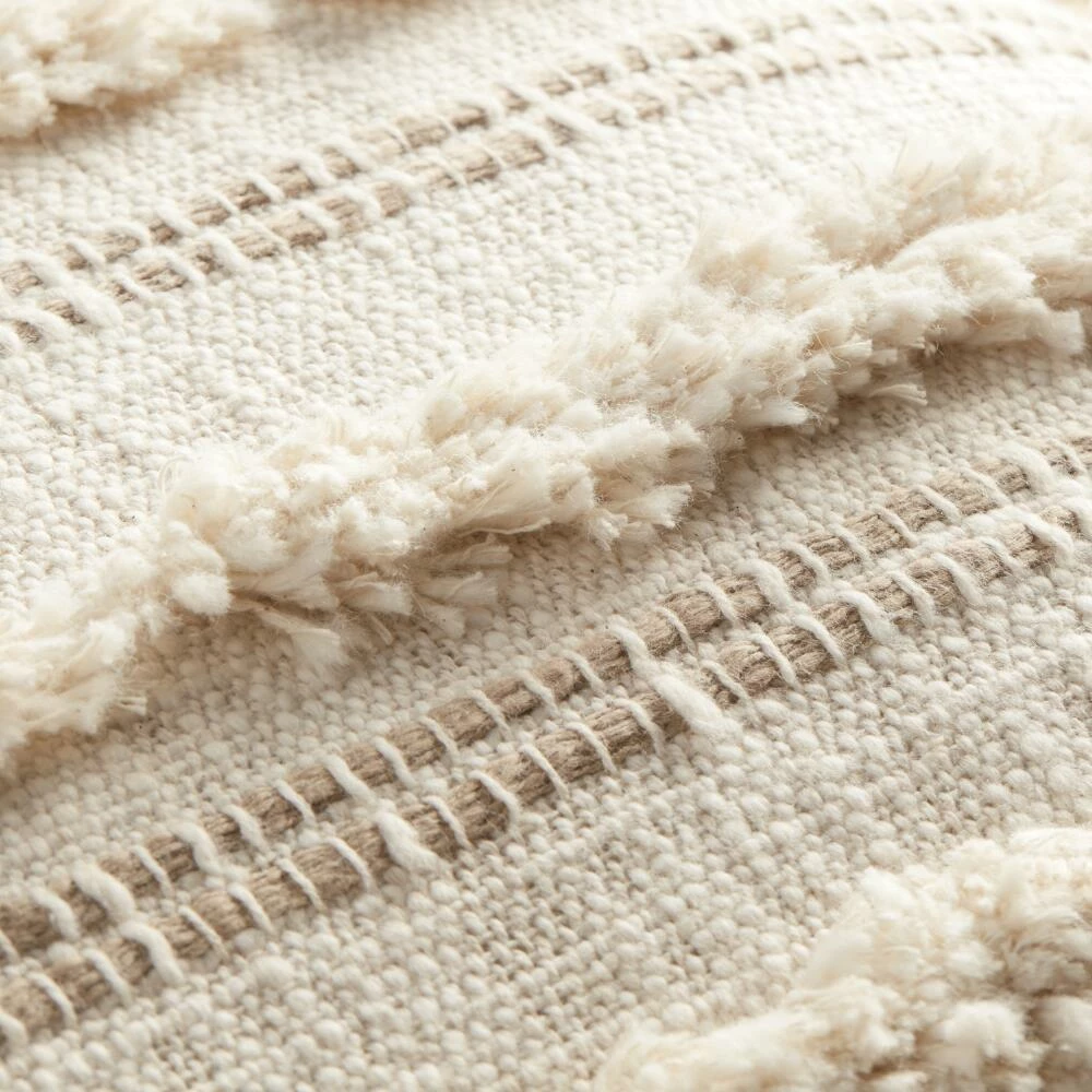 With neutral tones and soft textural details, this exclusive throw pillow adds a fresh, comfortable decor finish to any living space. Featuring eyelash-yarn tufting in ivory and woven stripes in taupe, this toss pillow easily mixes with other pillows in a variety of colors and styles and includes a plush removable insert.