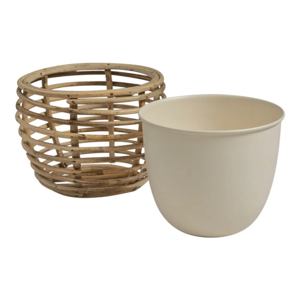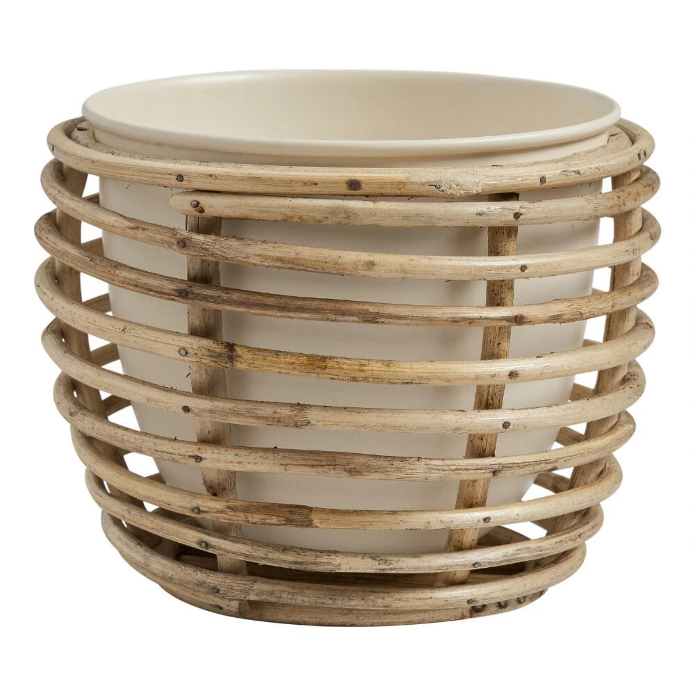A vessel worthy of your favorite foliage, our exclusive planter is crafted with a removable off-white metal planter and a hand-wrapped rattan cane stand. An infusion of mixed-material magic, it makes a stunning stand-alone piece or addition to your current houseplant collection.