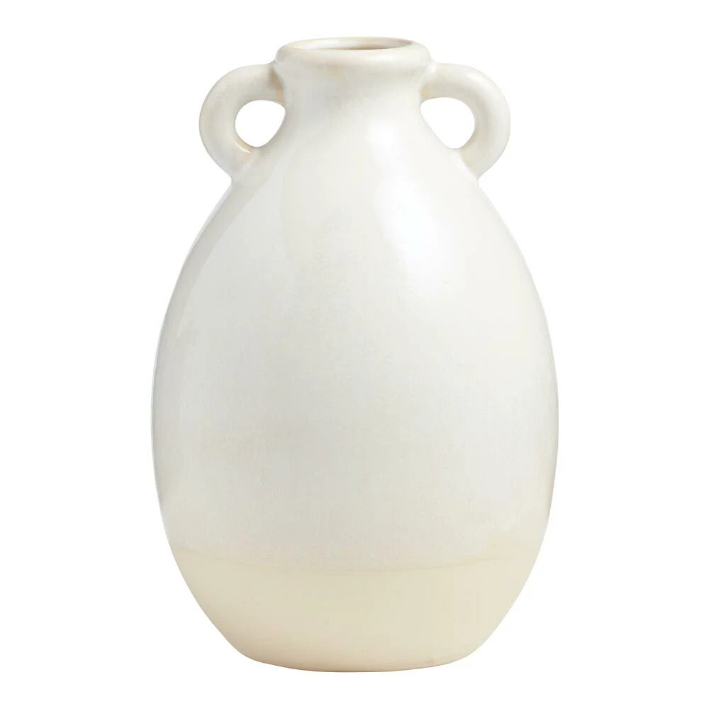Whether filled with fragrant blossoms, a few rustic branches or faux palm leaves, the Olivia jug vase displays your greenery with grace. Hand-glazed in pearlescent ivory, its reactive finish and raw base lends an elevated rustic look to a shelf, kitchen island or coffee table.