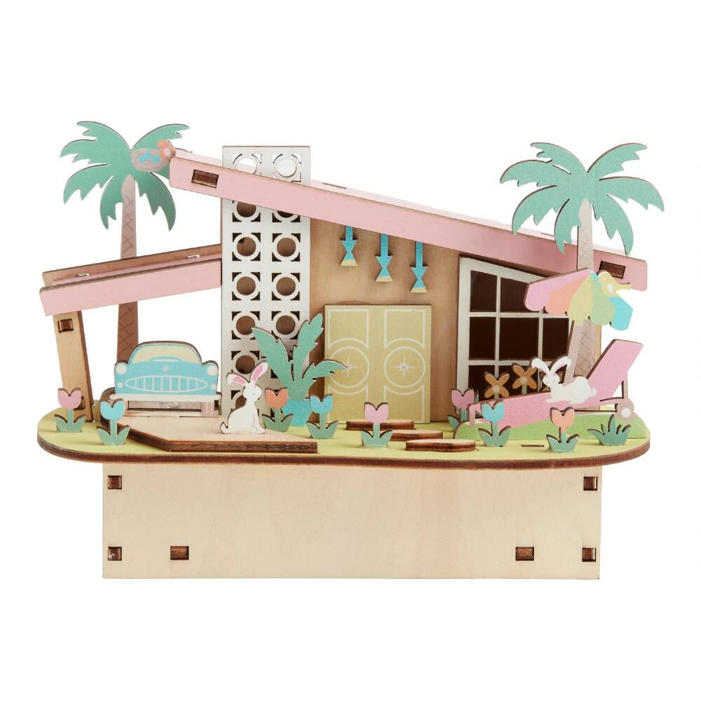 Give your Easter decor a mid-century makeover with our inviting laser-cut wood abode, designed in-house at World Market. The hand-painted piece features the clean lines and cool style of classic MCM design, dressed up for spring in dreamy pastels and accented with flowers and bunnies. Lit from within with LED bulbs, this retro residence beams with architectural charm.