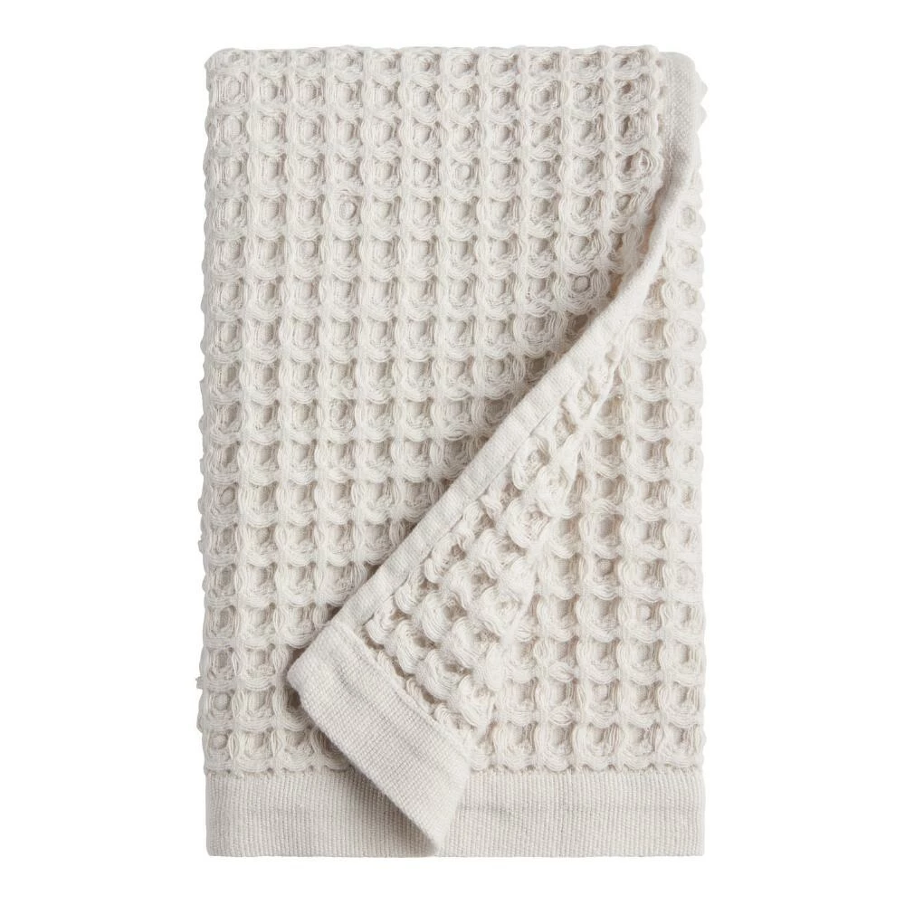 Experience spa-like luxury in the comfort of your home with our exclusive light gray cotton waffle-weave hand towel. It has a soft touch and adds a sophisticated look to any washroom.