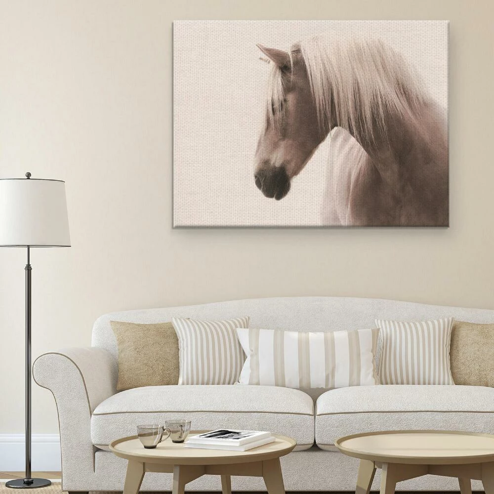 Rendered in dreamy sepia tones, this stunning photograph wall art captures a horse, its head in profile, emerging from the mist. Hang this gallery-wrapped canvas wall decor in your bedroom or living space for a touch of tranquil style.