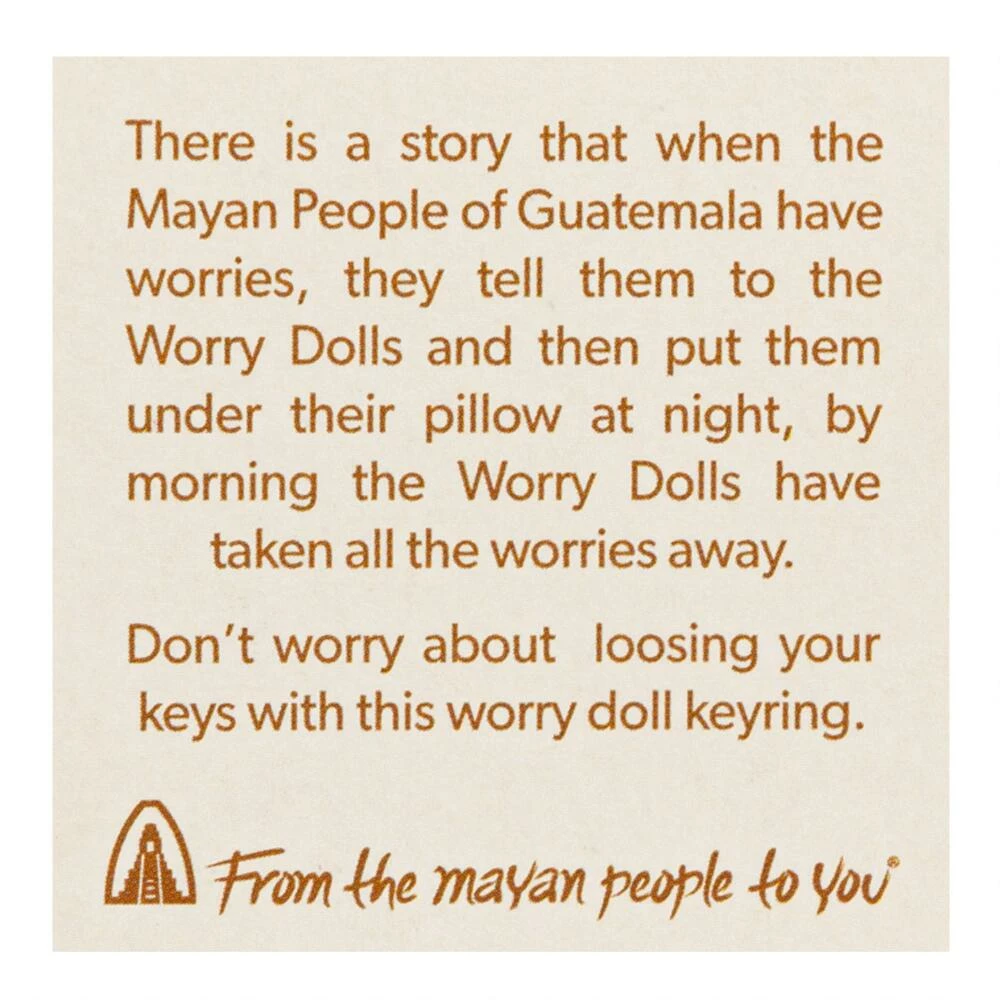 Spread the love with this set of five Worry Doll keychains, sure to delight friends and family during the season of giving. Inspired by the folklore belief that telling a Worry Doll your worries then placing it under your pillow at night rids you of anxiety, these helpful amulets are handmade by Mayan artisans in the highlands of Guatemala.