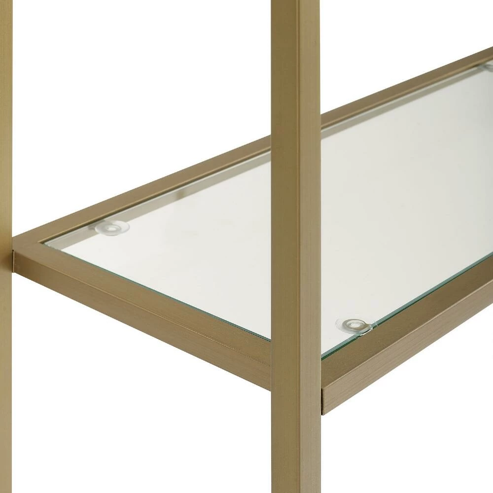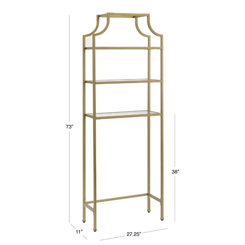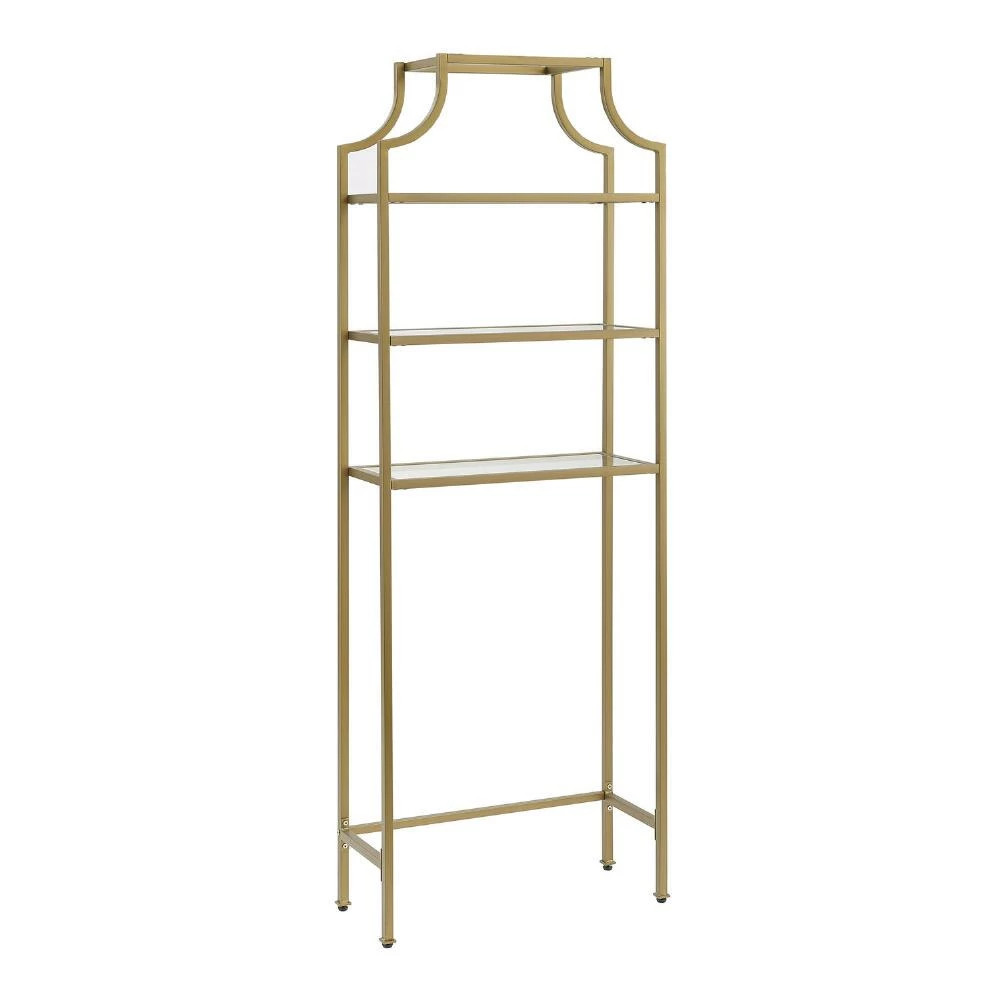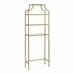 A compact bathroom storage solution, our modern over-the-toilet shelf neatly stores your essentials without compromising floor space or looks. It features a sculptural pagoda-style steel frame finished in antique gold that houses three tempered glass shelves for convenient organization with a sleek appeal.