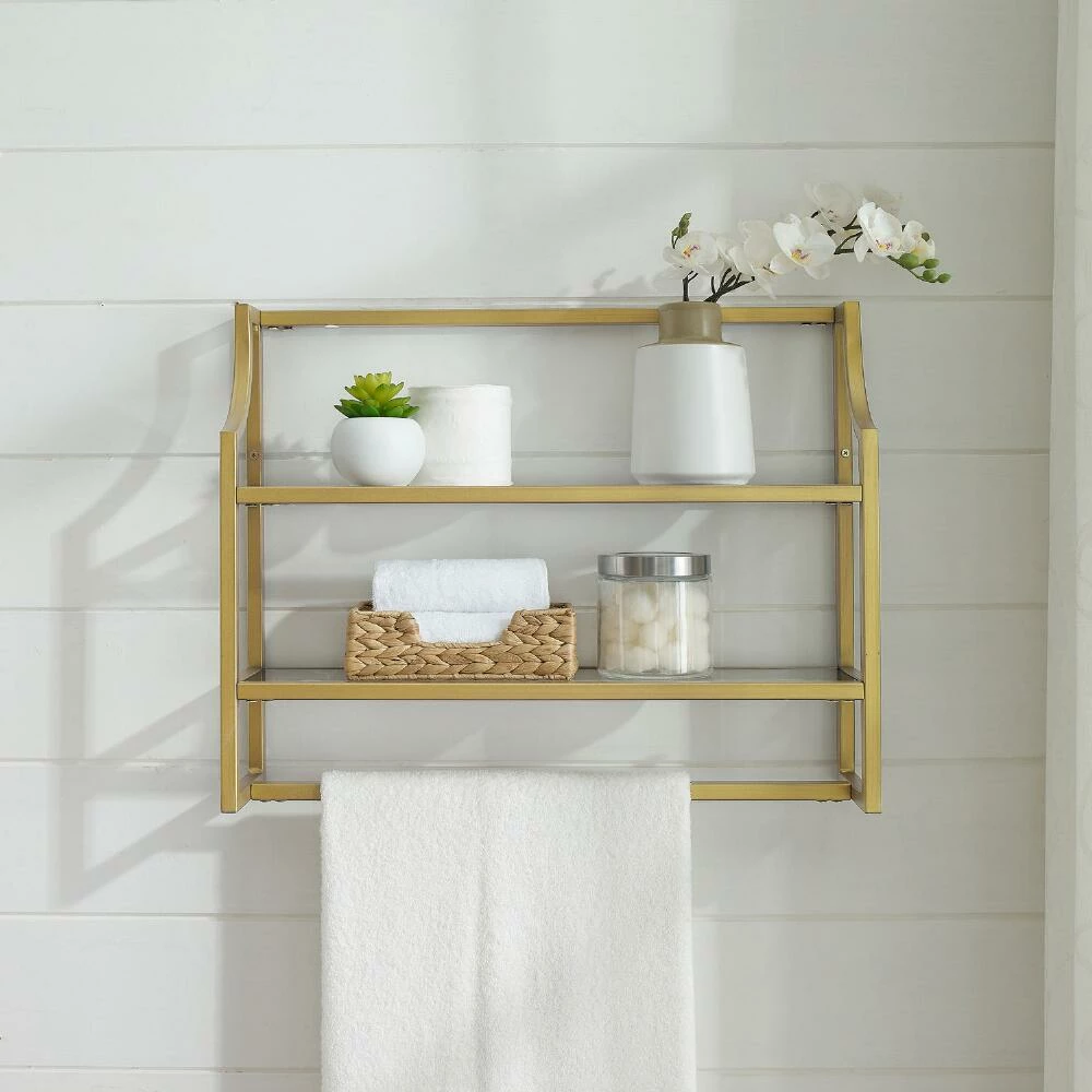 A compact bathroom storage solution, our modern wall shelf neatly stores your essentials without compromising floor space or looks. Complete with a towel bar, it has a sculptural pagoda-style steel frame finished in antique gold that houses two tempered glass shelves for convenient organization with a sleek appeal.
