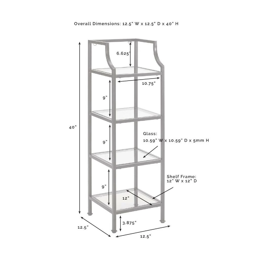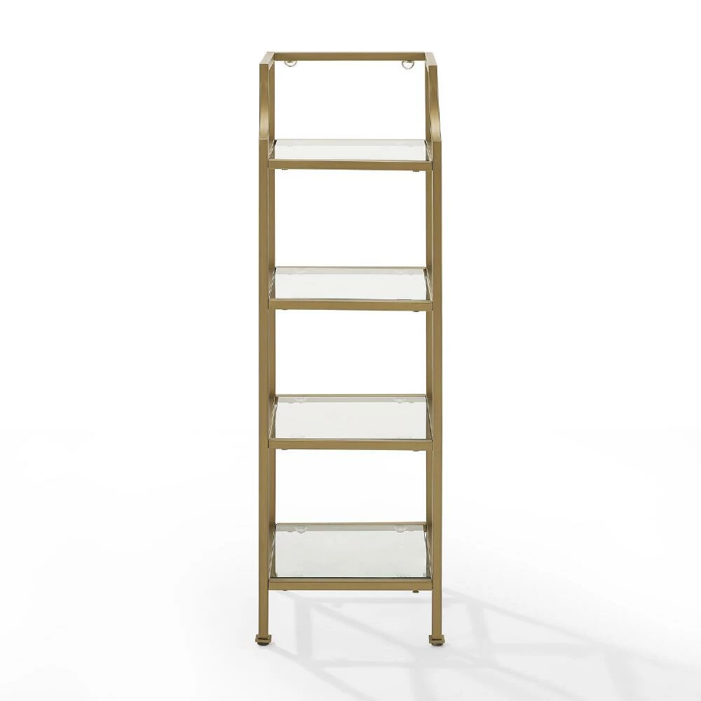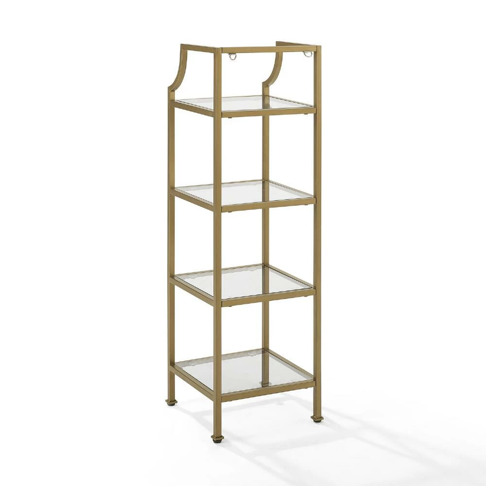 A compact bathroom storage solution, our modern etagere shelf neatly holds your essentials with a petite footprint and mid-century-inspired look. It features a sculptural pagoda-style steel frame finished in antique gold, housing four tempered-glass shelves for convenient organization with a sleek appeal.