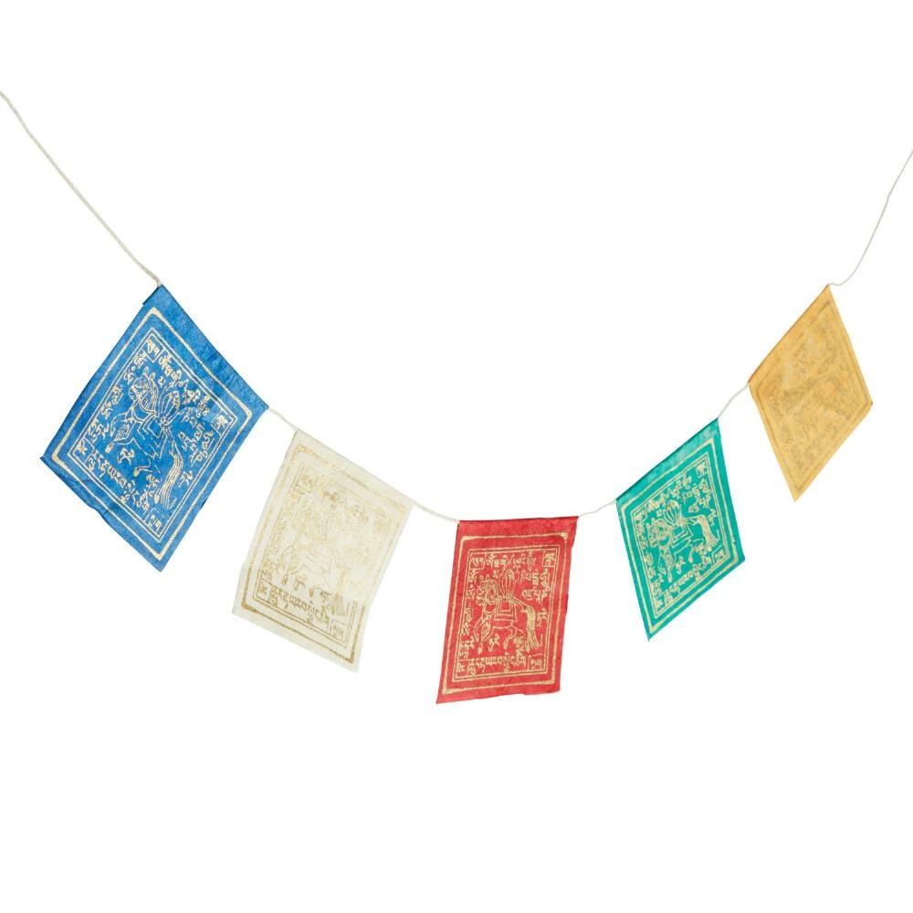 A mini paper version of the classic fabric prayer flags, these vibrant garlands are screen-printed in Nepal on handmade lokta paper. In a quintet of colors that symbolize sky, air, fire, water and earth, they bring bright elemental style to your space.