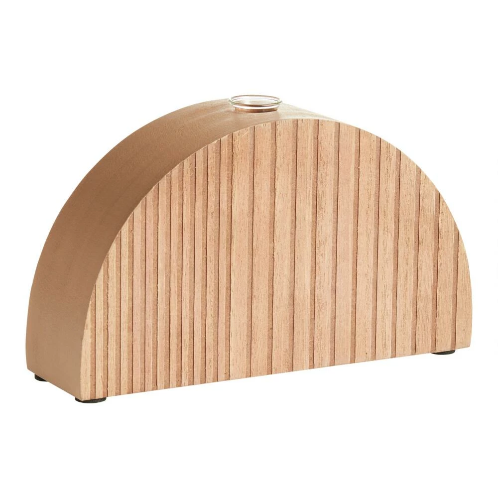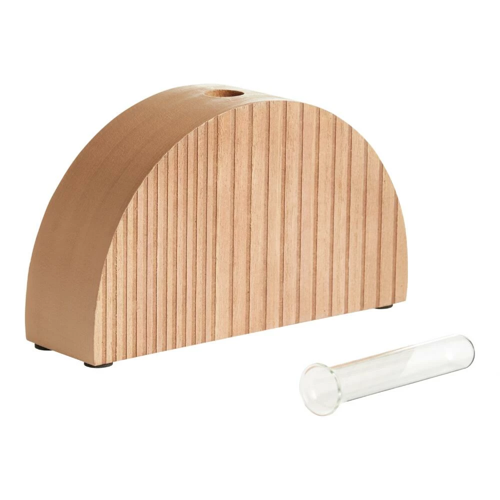 Display a single flower or propagation stem in artistic fashion with this arc-shaped vase. We love its tan finish, dimensional grooves on the front and the glass vial that slips inside for a sleek, minimalist look whether placed on a tabletop, mantel or floating shelf.
