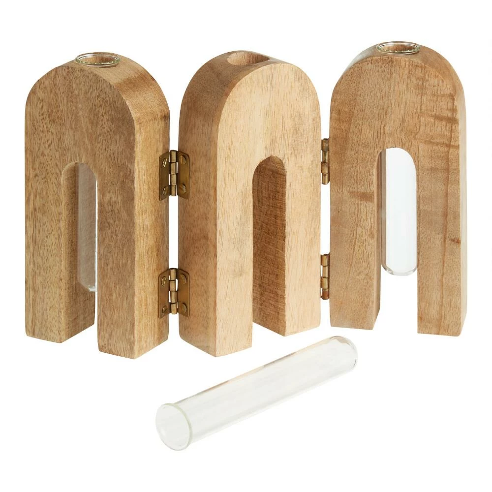 A contemporary way to display single stem flowers or propagation sprigs, our exclusive triple bud vase gives a sculptural finish any table, mantel or shelf. Handmade in India with hinged, modern wood arches holding glass test tube vases, it can fold into itself making a stacked, staggered or straight line to your liking.