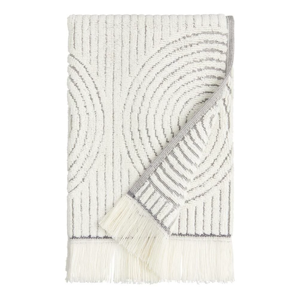 Crafted in Portugal from 100% cotton for its luxurious feel and absorbency, our exclusive hand towel features a chic sculpted spiral design. The perfect update for any bathroom, the modern geometrical motif in stylish gray and off-white hues and the gentle fringing bring a very contemporary feel to wash time.