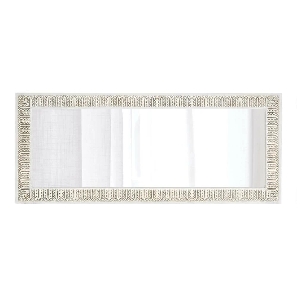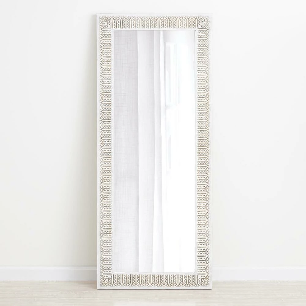 Carved with a nature-inspired leaf motif and finished in an antiqued whitewash, our full-length mirror brings a calming vibe to your bedroom or living room. Creating a more spacious look and feel in your space with its reflective qualities, this rustic wood mirror amps up the texture and pattern appeal in any room.