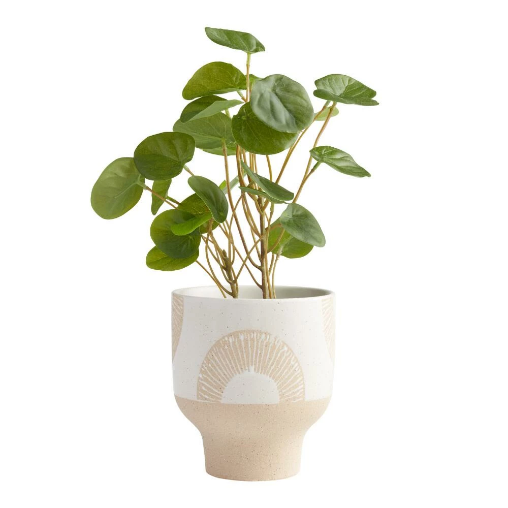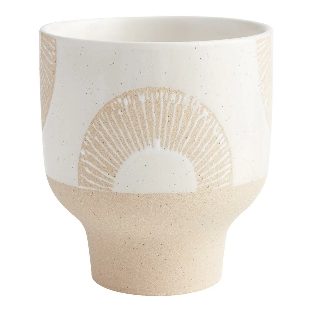 The perfect place to plant something gorgeous, this natural-and-white pot is a work of art all on its own. With its lovely pedestal shape, half-circle motif and a subtly speckled finish, it brings warm modern style to your home.