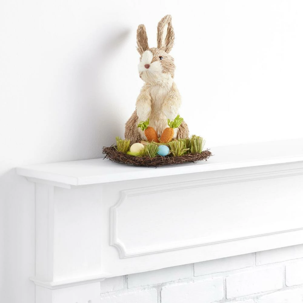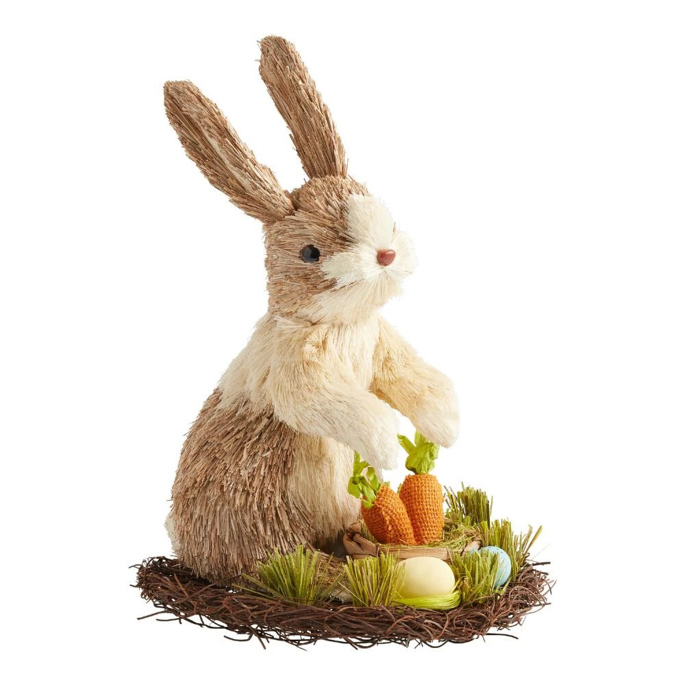 Handcrafted from natural sisal and adorably arranged for spring, our rustic rabbit lends farmhouse-inspired charm to the Easter season. This white-and-brown bunny is nestled in a nest of grass, eggs and carrots, ready to add a fresh look to your tabletop or mantelscape.