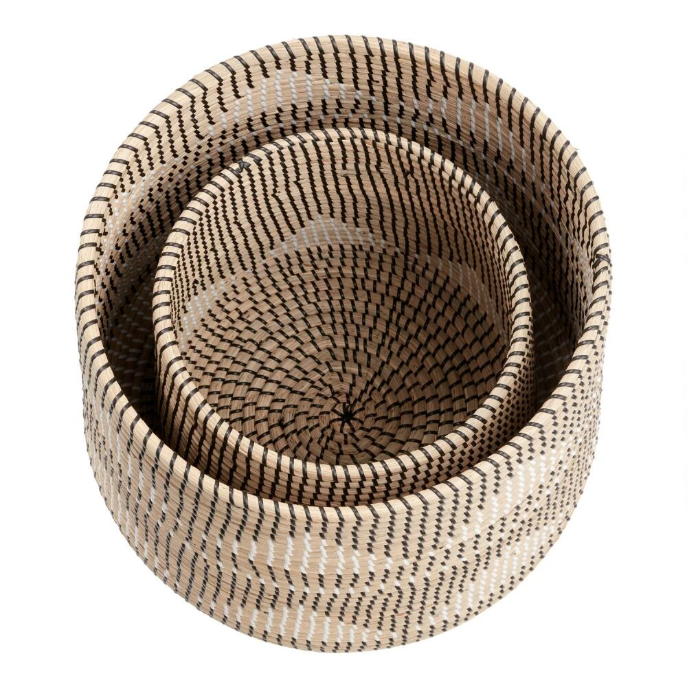 Natural seagrass weaves together with black and white recycled plastic to form the bold triangle patterns of our contemporary Nigel basket. Broad-based and sturdy in two roomy round sizes, it delivers loads of clutter-catching capacity in statement-making style.