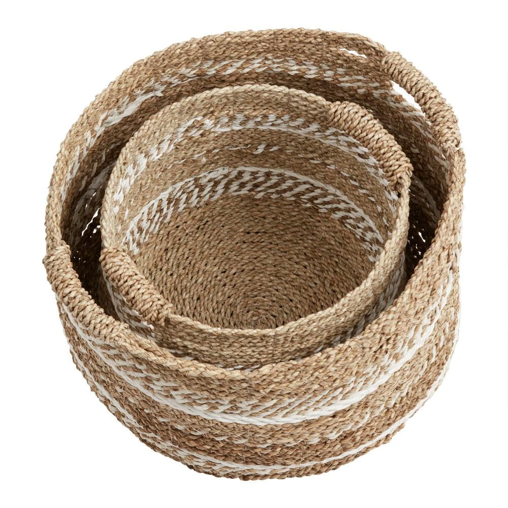 From Indonesia, the Randi basket is woven from seagrass and raffia with white horizontal stripes that create striking textural appeal. This versatile storage piece exudes a casual sophistication, making it a chic addition to a range of decor themes.