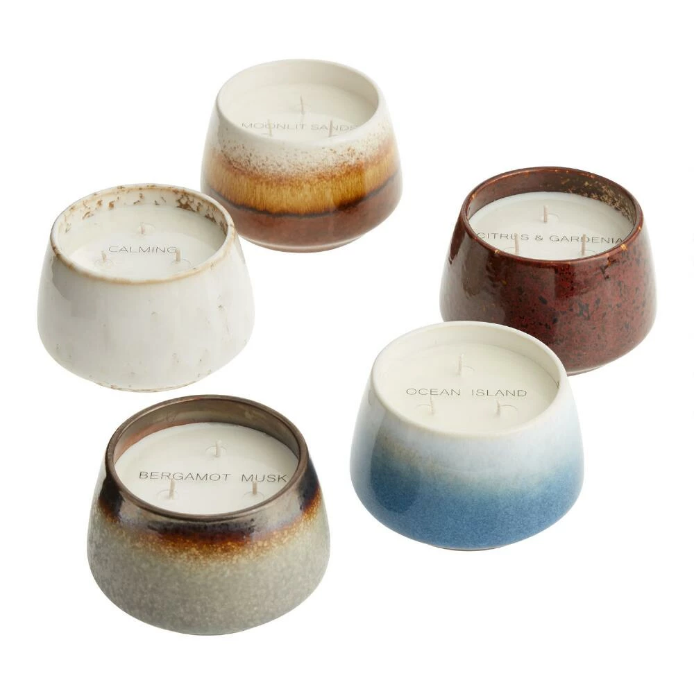 Our reactive glaze candle has an artisan-crafted feel that gives it a distinct sense of style. Made with fragranced soy wax, sought after for its slower burn rate, you can choose from: Moonlit Sands with notes of coconut, gardenia and sandalwood; Calming, with woodsy notes, green leaves and floral touches; Citrus & Gardenia with base notes of tonka; Bergamot Musk; or fresh Ocean Island with berry notes and a musk base.