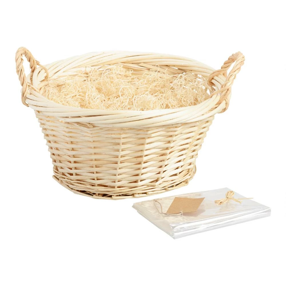 Perfect for putting together a hand-picked personalized selection of gifts, our exclusive natural gift-basket kit is perfect for birthdays, baby showers, hostess gifts and more. The kit includes a sturdy, round woven basket with carrying handles, plus raffia, a gift tag, excelsior and a clear basket bag to wrap it all up. Create a themed gift with our exclusive bath products, an array of foodie treats or a selection of fun toys for the kiddos.