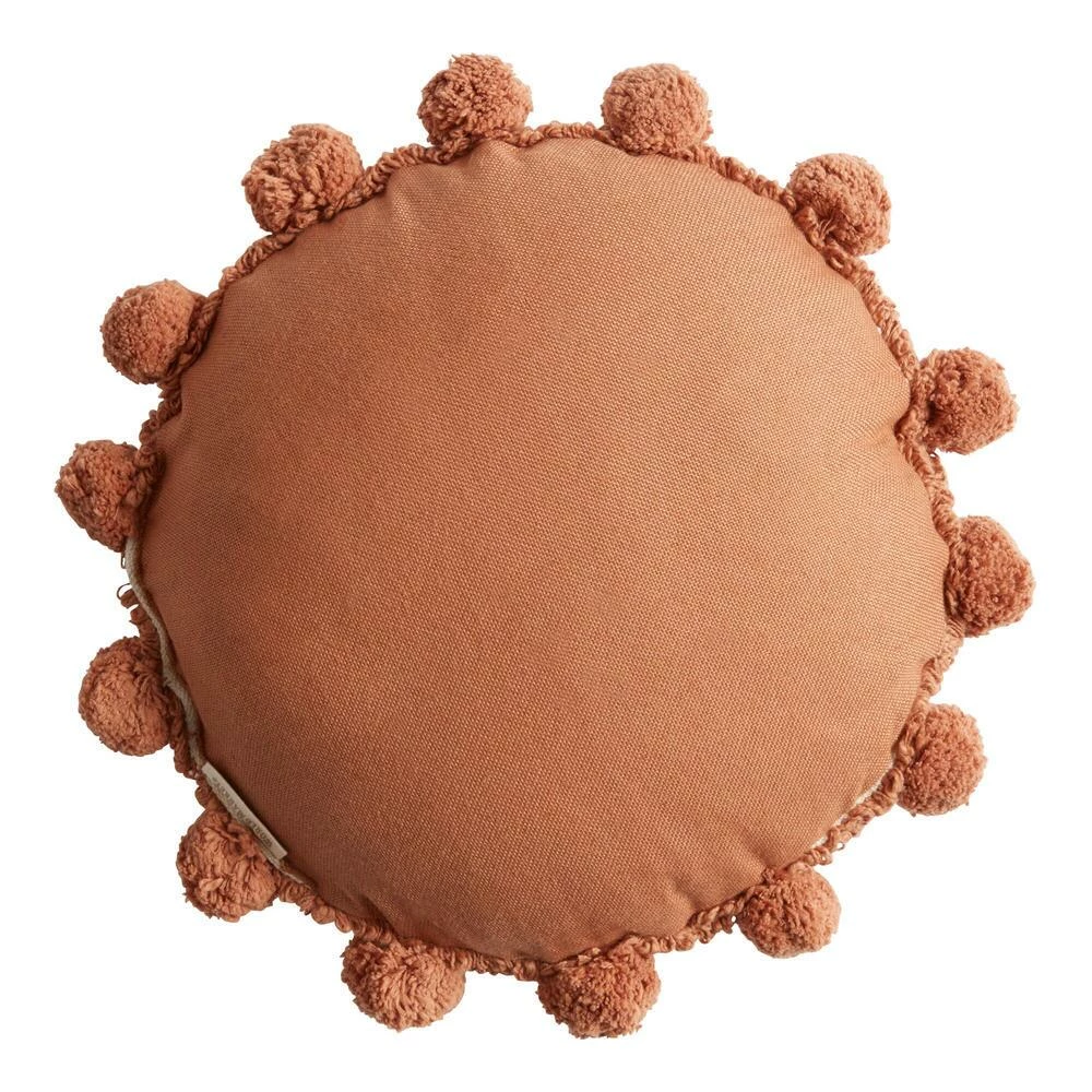 This rust-colored pom-pom accent pillow is a playful addition to your stylish home decor. The warm, rich tone will make any room feel instantly cozy and is neutral enough to mix and match. With nubby tufting on the front, fluffy pom-pom trim and a solid canvas back, this round toss pillow is a textural treat for your living space.