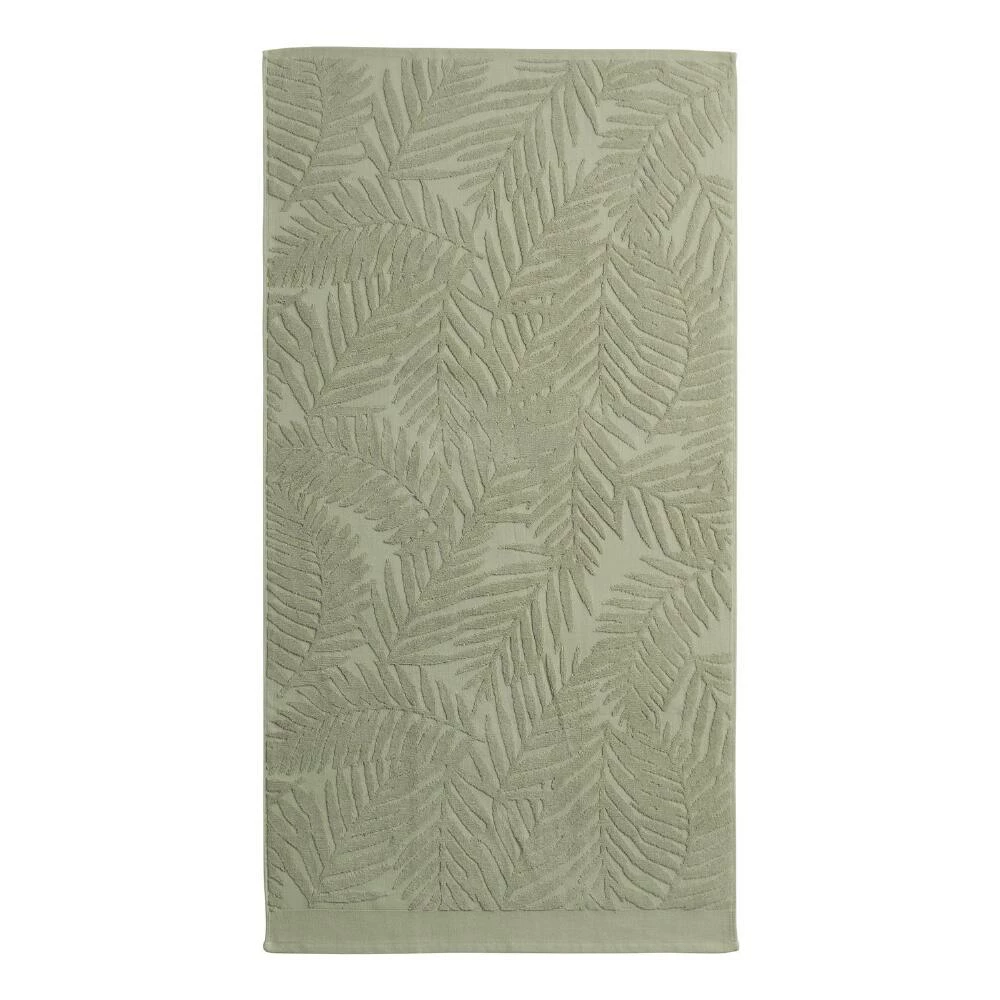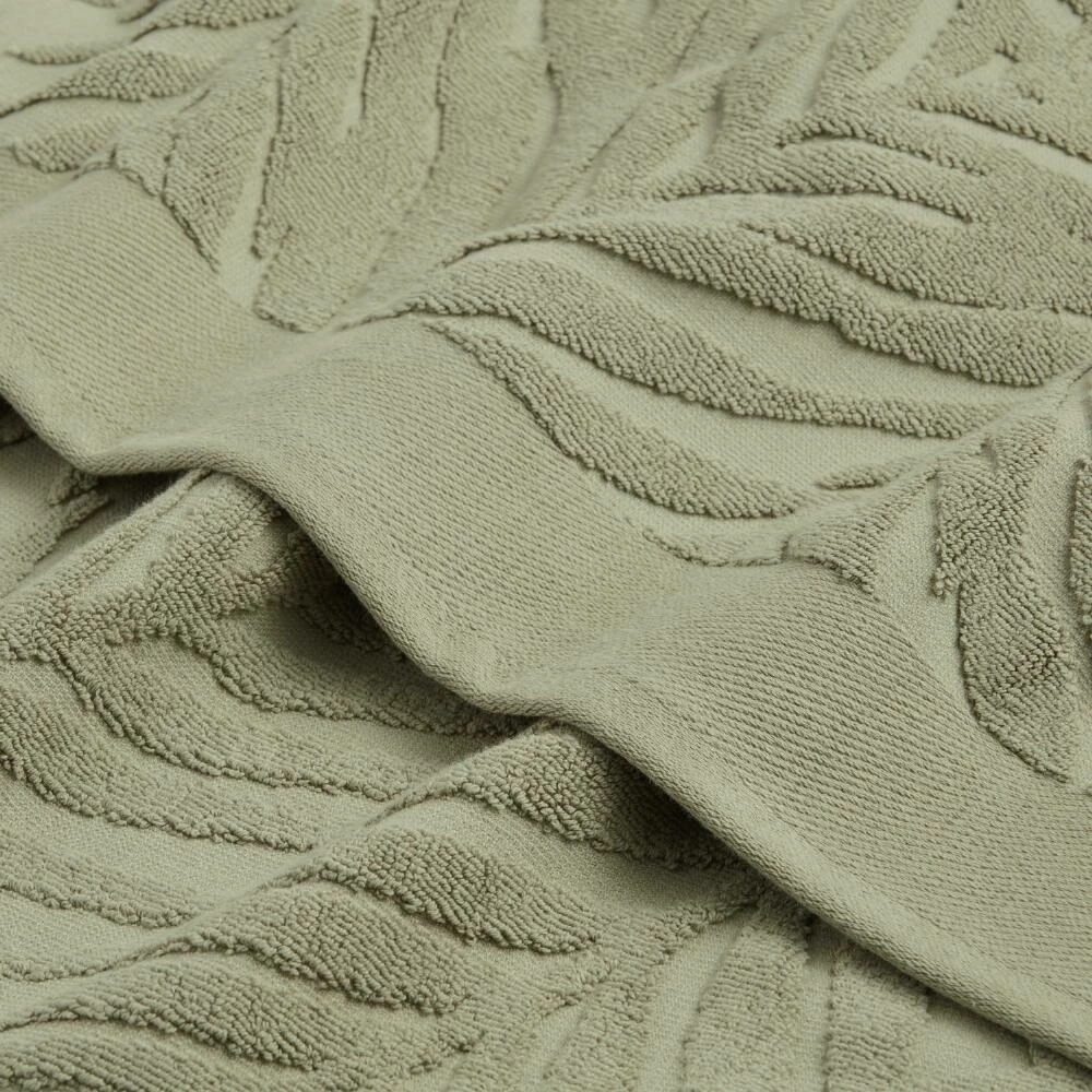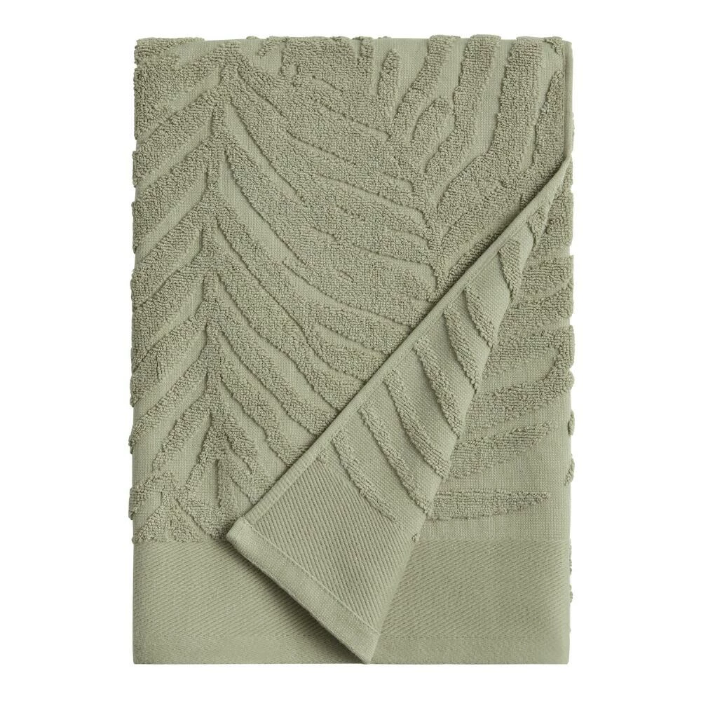 Our exclusive 100% cotton jacquard bath towel features a sculpted palm-leaf design, adding a dash of the tropics to your decor. Crafted in a sage-green color, its super-soft dimensional texture makes a delightful addition to your bathing routine.
