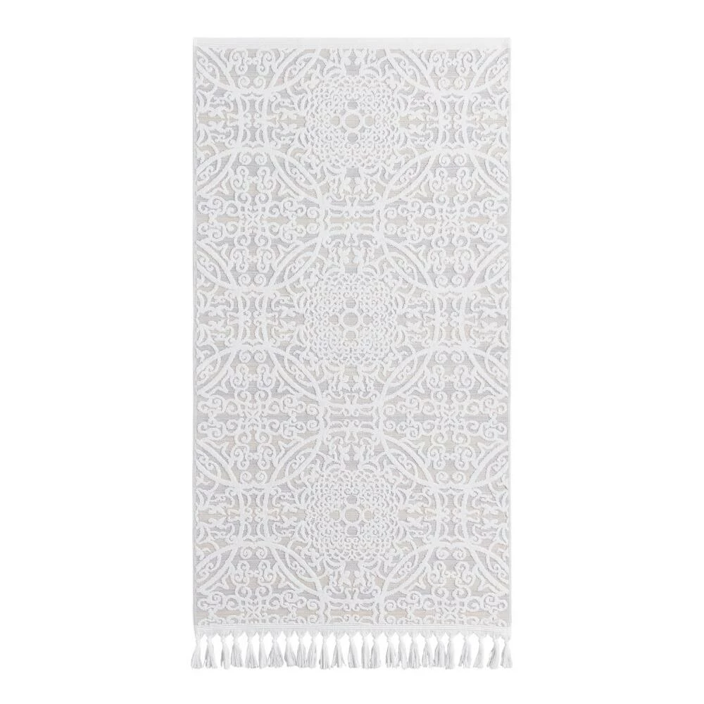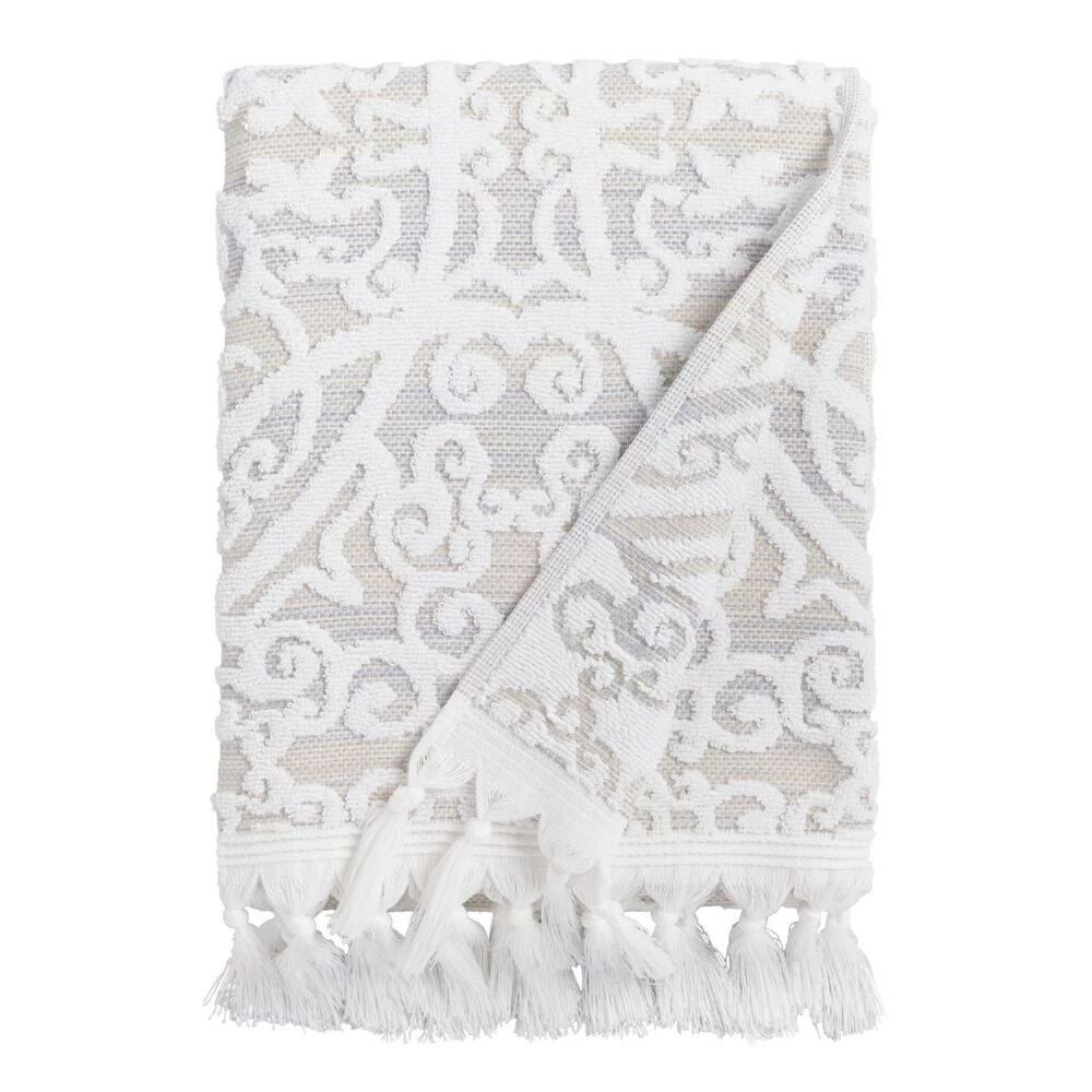 Featuring a sculpted medallion design in white on a taupe background, our exclusive bath towel brings a chic flair to your bathroom decor. White knotted fringe along the bottom adds a finishing touch.