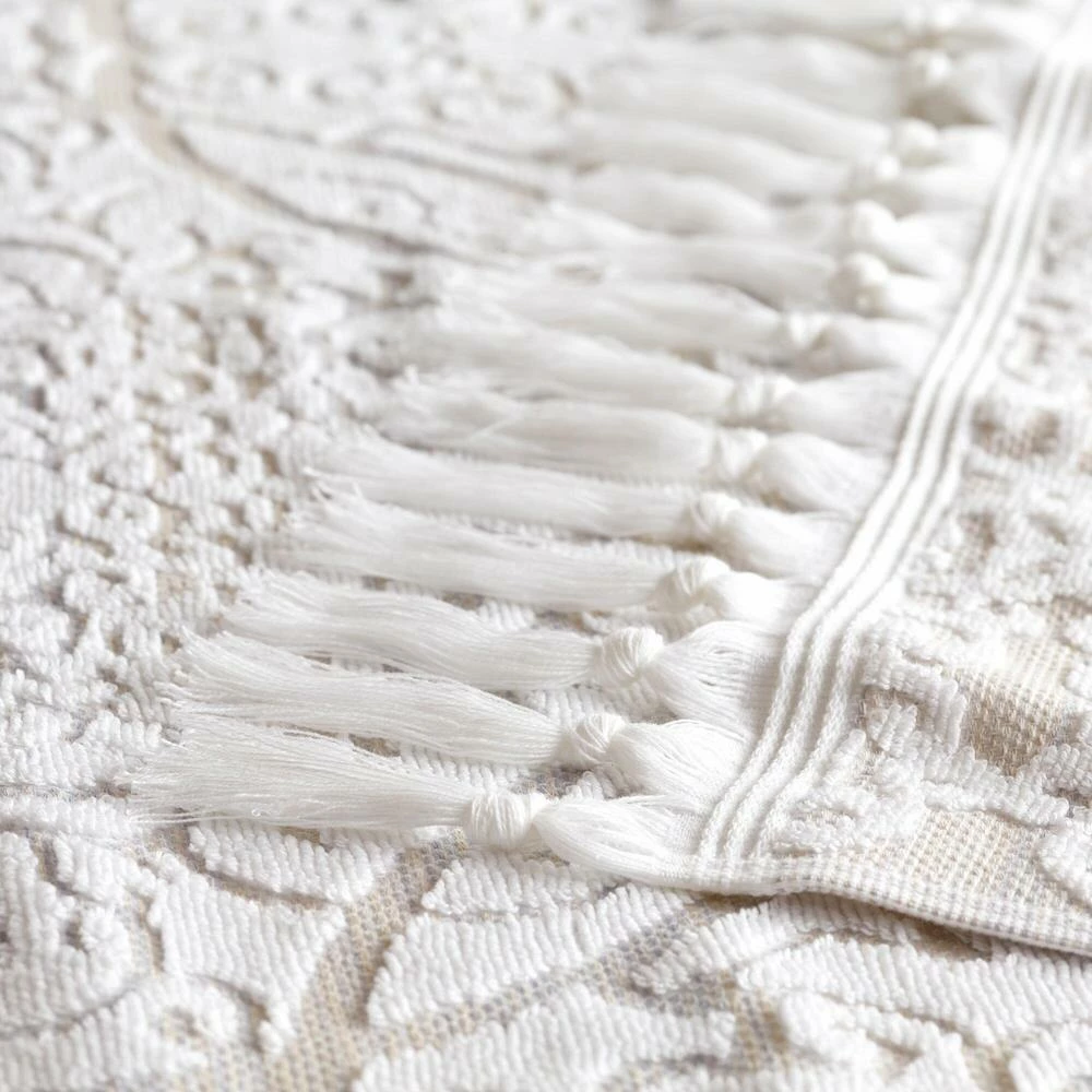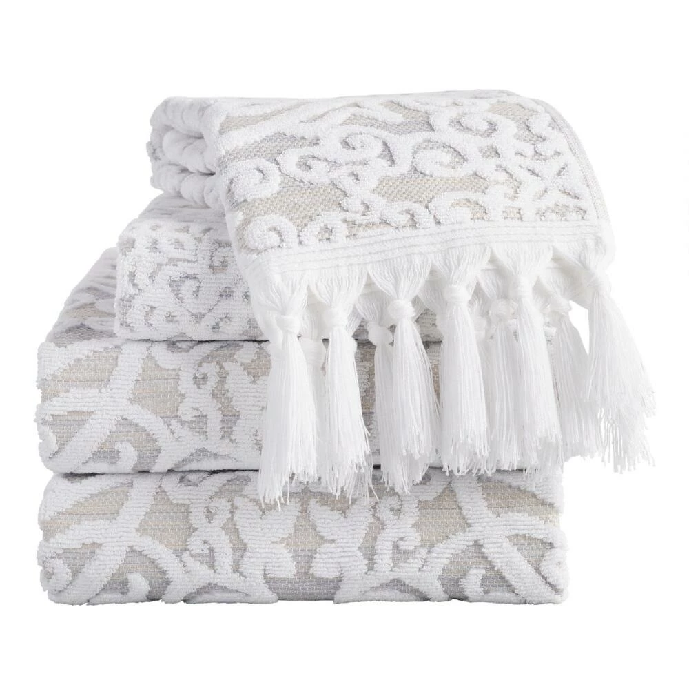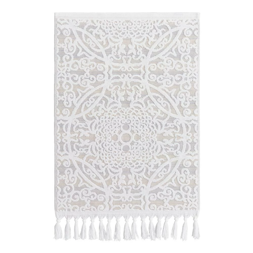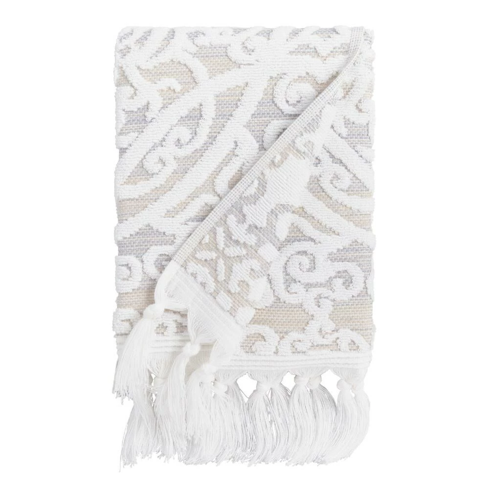 Featuring a sculpted medallion design in white on a taupe background, our exclusive hand towel brings a chic flair to your bathroom decor. White knotted fringe along the bottom adds a finishing touch.