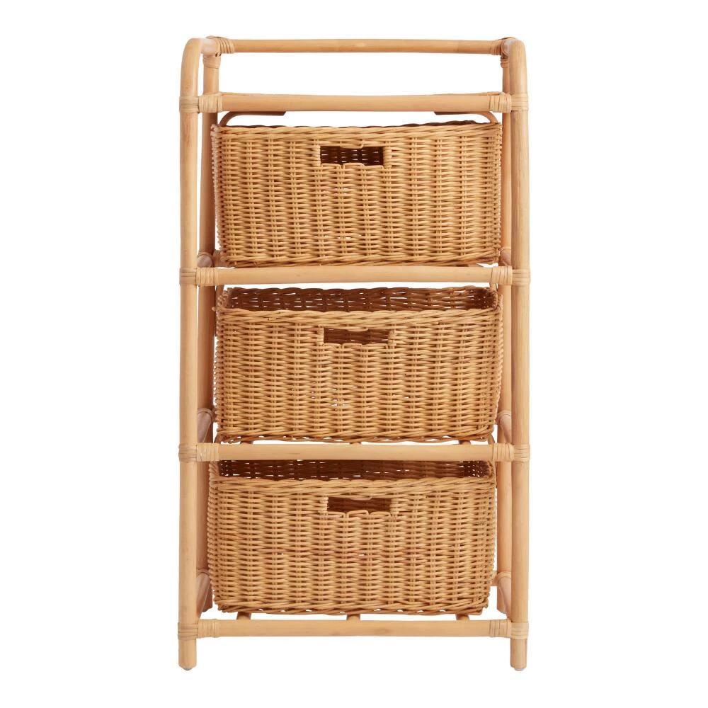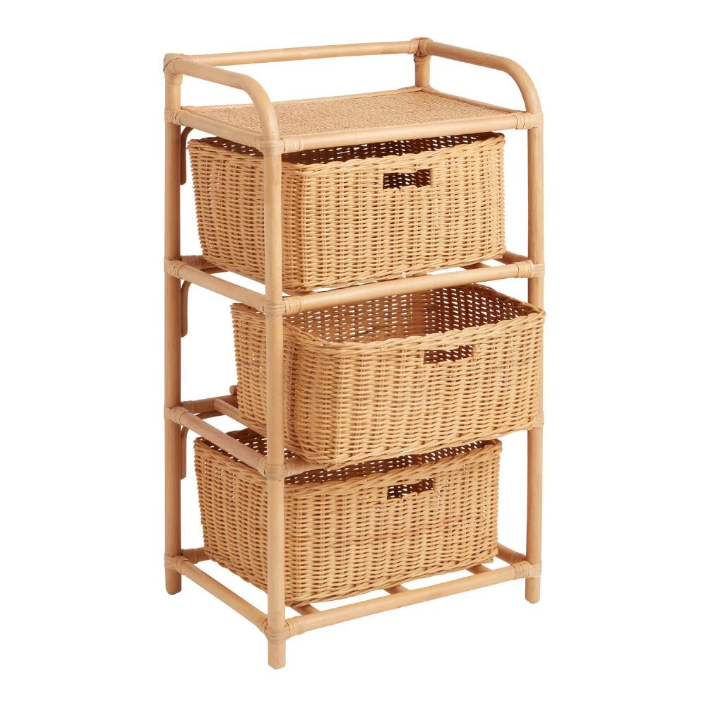 Handcrafted by Indonesian artisans, our exclusive rattan storage tower features three baskets to tuck away clutter and a handy surface to keep essentials within reach. With a bohemian vibe inspired by the tropics, this storage tower is perfect for organizing toiletries and towels in the bathroom.