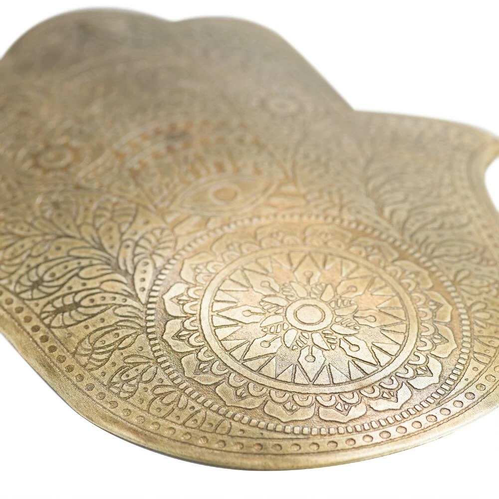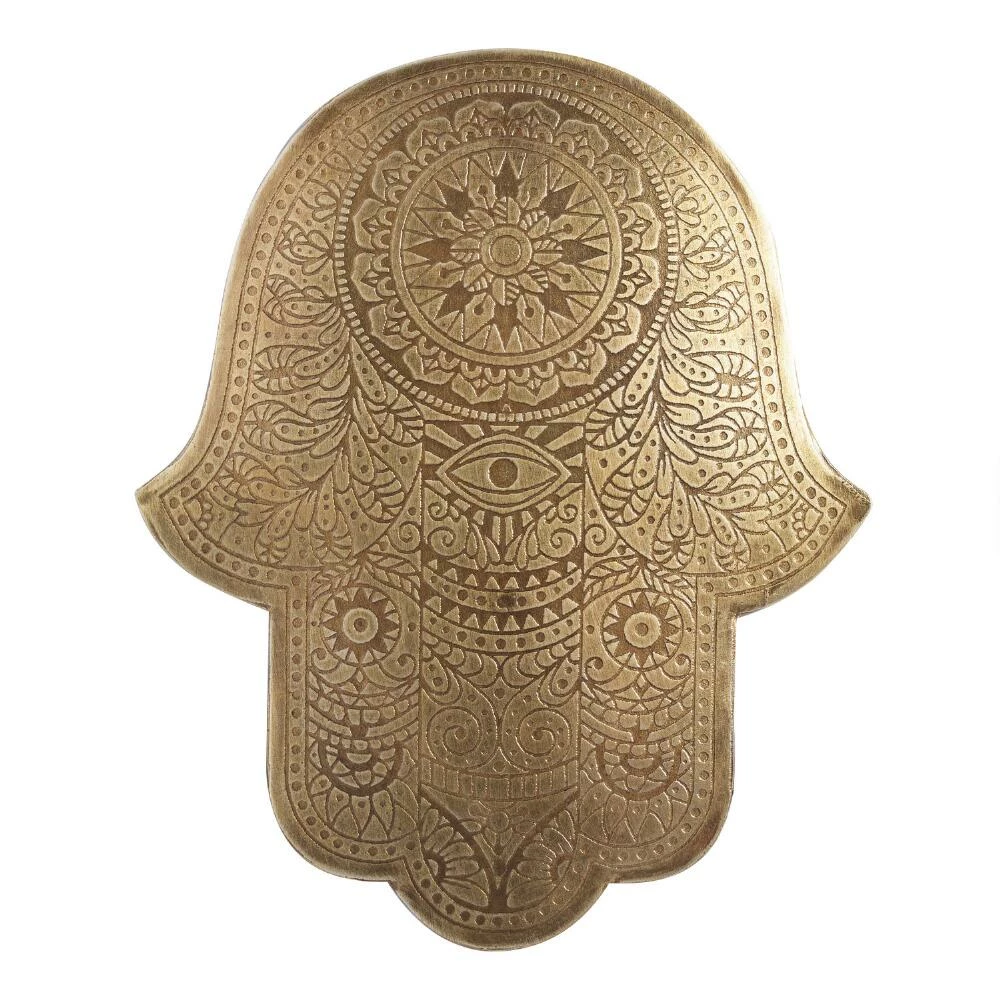 Our exclusive hamsa hand wall decor adds dimensional detail to your space. This antique-brass hamsa artwork, representing good fortune, is fashioned by artisans in India and embellished with sumptuous traditional designs.