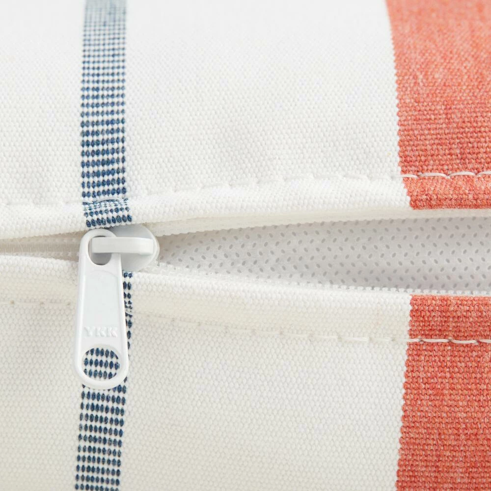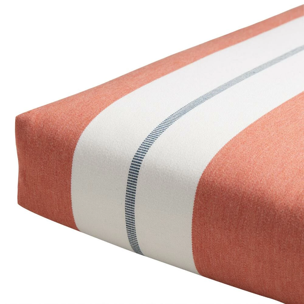 With a washed-terracotta, white and gray striped Sunbrella cover, our custom-made cushion updates the look and feel of your favorite seat. Sunbrella performance fabric is crafted of highly saturated, U.V.-stable pigments that don’t fade, it resists mold and mildew and is durable and easy to clean. Since 1961 Sunbrella has produced innovative materials while striving to make minimal impact on the environment and never sacrificing beauty or style.
