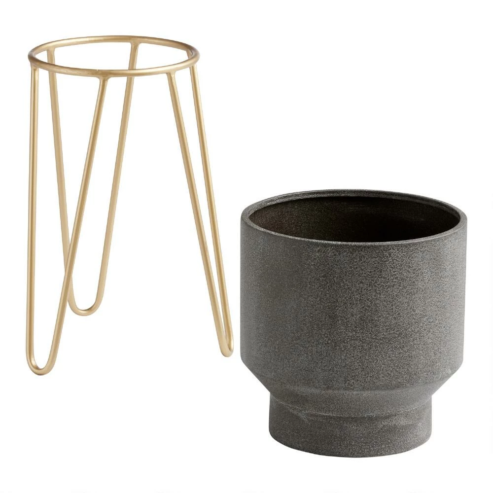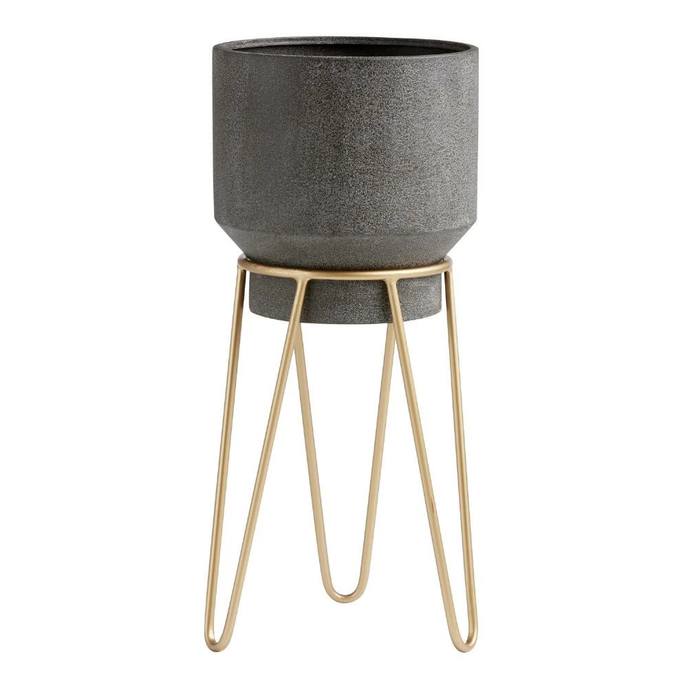 Give your greenery a modern home to thrive in with this tapered cylindrical planter and stand. A textured, soft-black metal pot sits atop gold mid-century hairpin legs to create a striking, contemporary decor statement in any room.