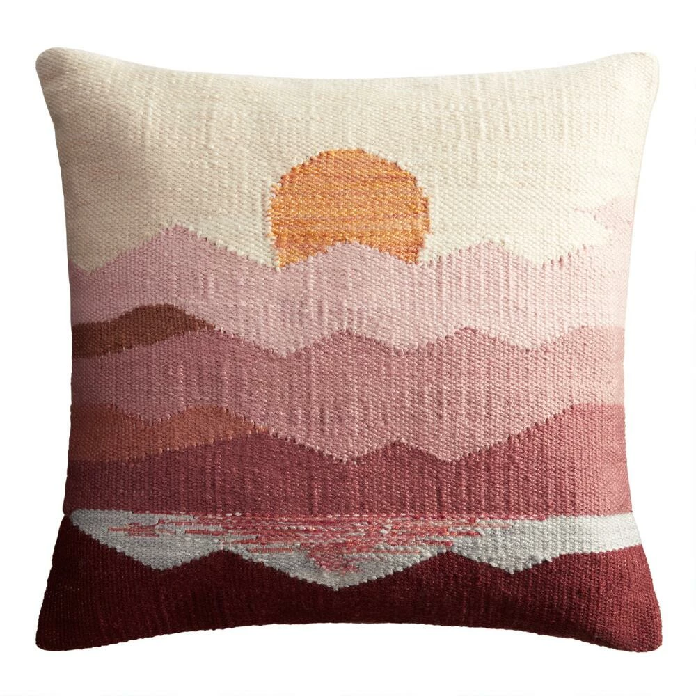 Consciously crafted with an innovative recycling process that gives discarded water bottles new life, our ultra-soft throw pillow features a stunning sunset woven across a natural-hued background. With a solid tan back and a removable insert, this toss pillow has a textural softness that’s perfect for cozying up.